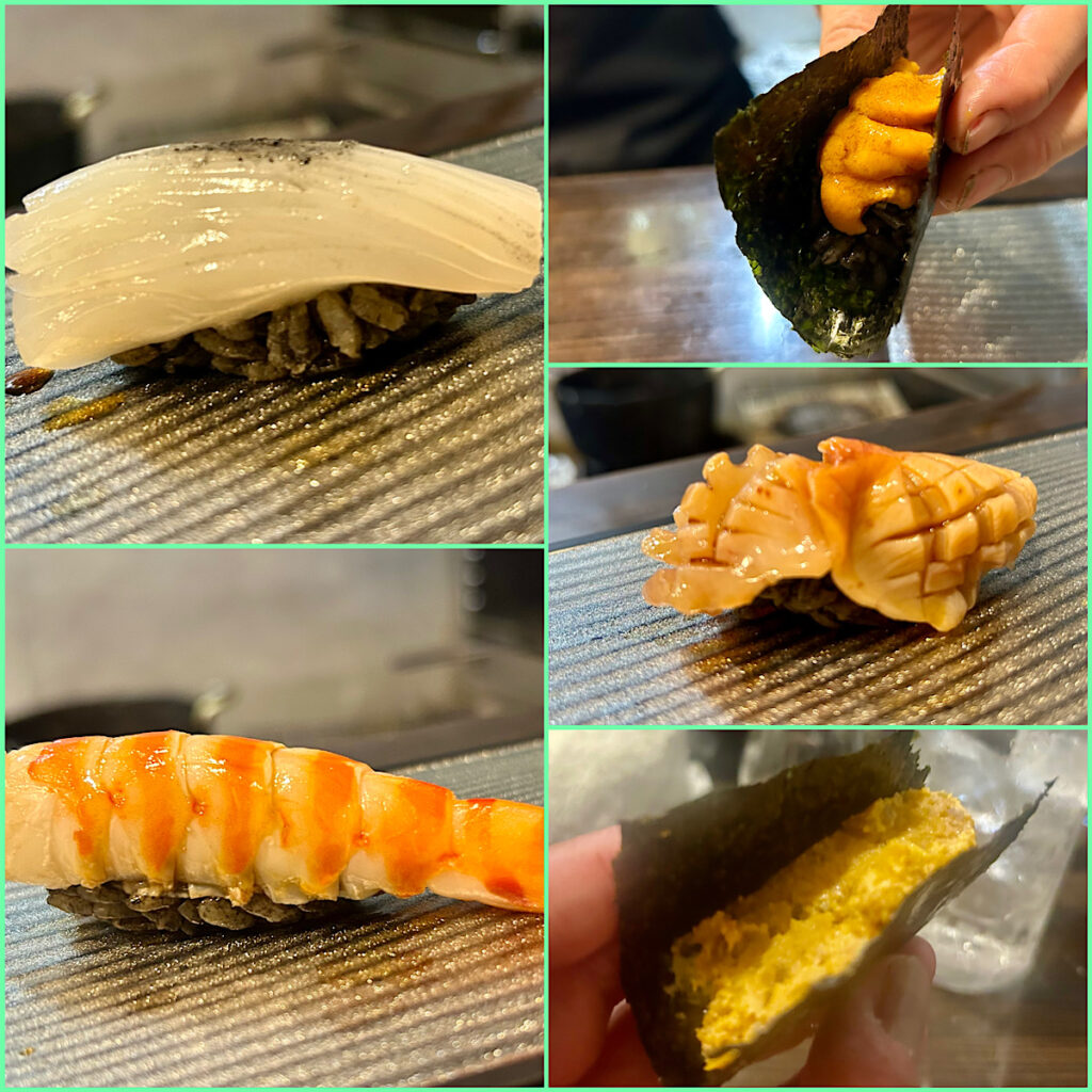 墨塩を乗せた剣先烏賊、天然車海老、北海道の雲丹、マグロが苦手なので代わりに赤貝、玉子焼きでフィニッシュ。。