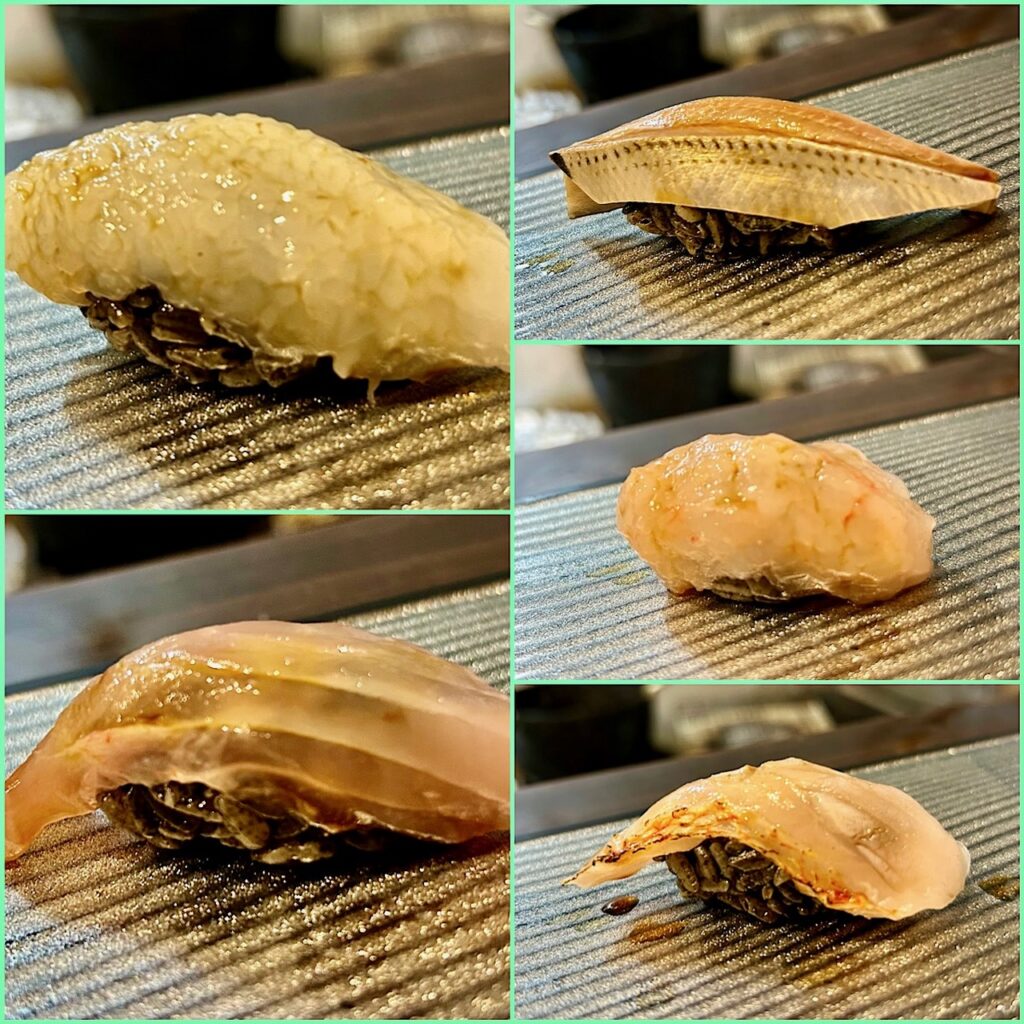 握りの扉は200回以上包丁を入れた烏賊からスタート。黒いシャリはイカ墨を使用。のどぐろ、鰯、甘海老の昆布締め、金目鯛と続く。