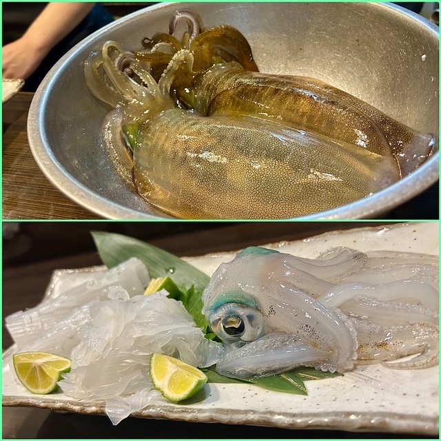 途中で本日のメインディッシュの烏賊の活造り登場。この日は巨大なハリイカ。身厚で食べ応えも満点。2種類の切り方で食感の異なりを楽しむ。烏賊の墨の入った塩をつけていただくと甘さが引き立って最高の味わいとなる。残酷だけど美味しい・・・・