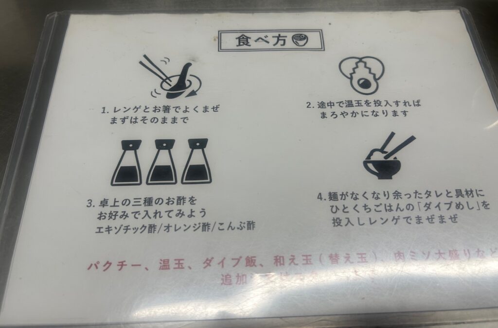カウンターの上には食べ方マニュアルがあり、待っている時間で学習する。