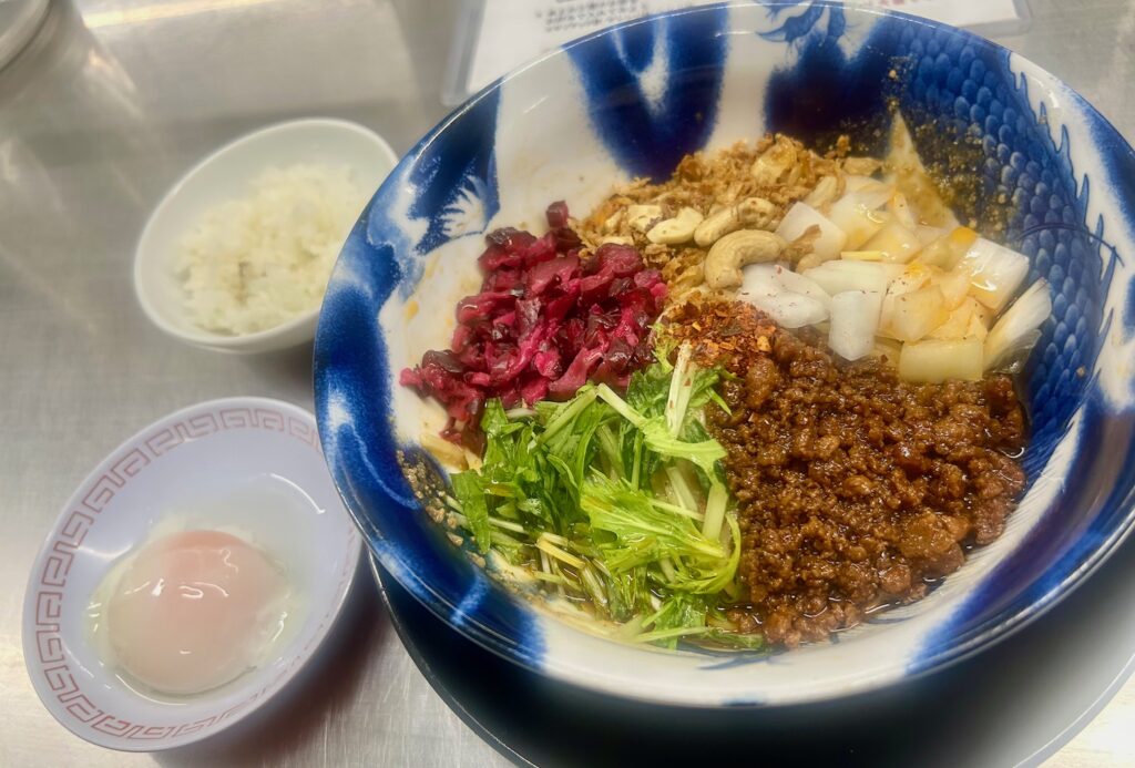 前回の訪問時はカレー担々麺をいただいたので今回は温玉とダイブ飯がついたデフォルトの担々麺セット1150円を注文する。唐揚げや水餃子をつけたり痺れや辛さを増したりパクチーや和え玉なるものもある。