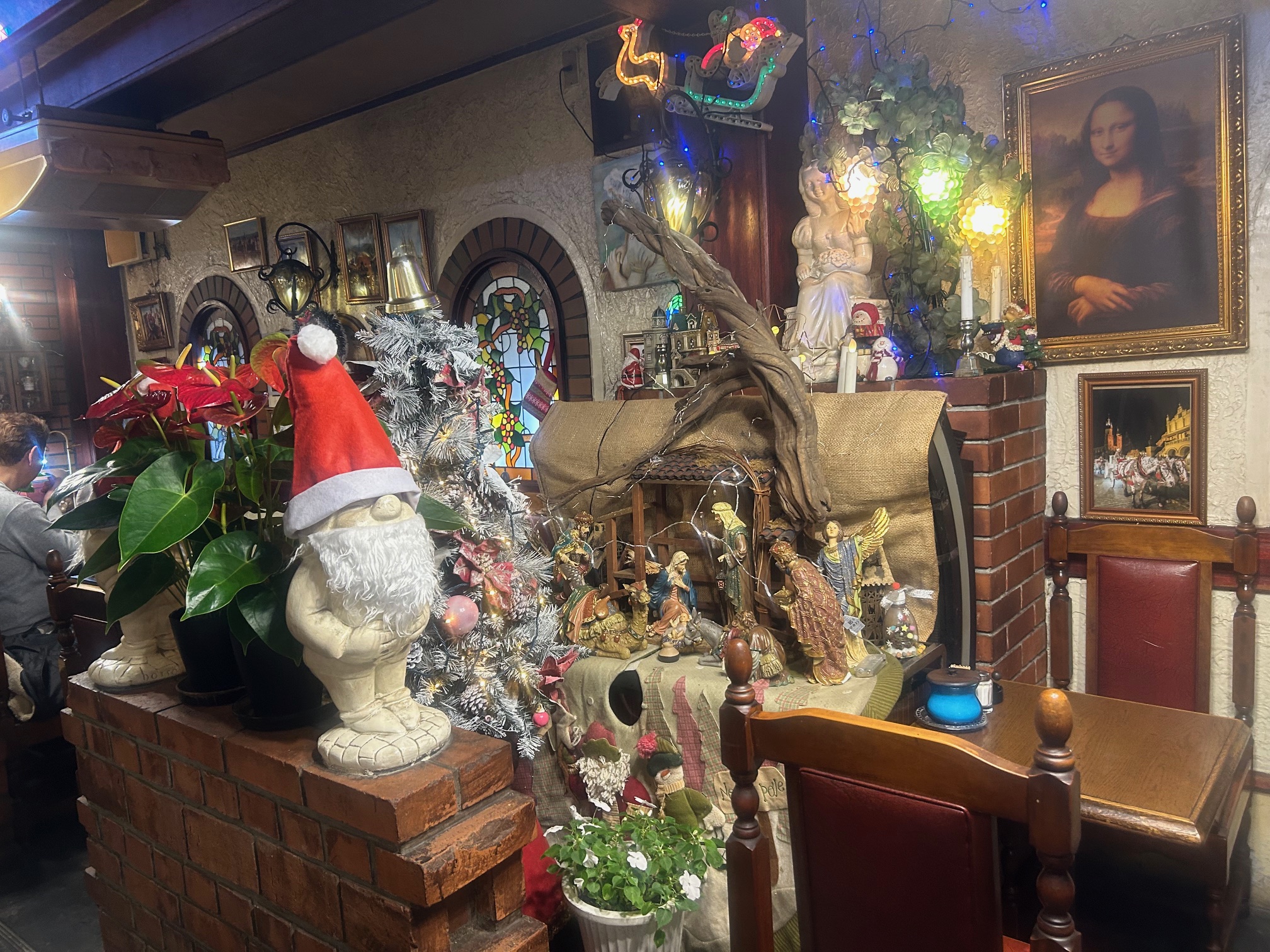 窓にはステンドグラス、店内はヨーロッパを思わせる複製絵画、電話ボックス、古時計、ランプシェードなどの小物やオーナメントが満載。外国の教会のよう・・・11月だけど既にサンタクロースや電飾などもあってクリスマス仕様となっている。