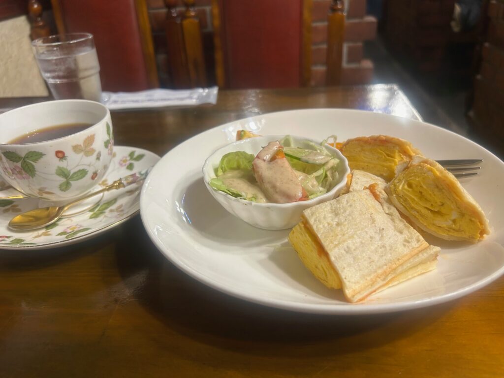 名物のホットサンド(コーヒー付き850円)を注文する。熱々で大きなたまごサンドのパンは薄いスライス。パンと卵焼きの間には自家製ケチャップとマヨとマスタードのようなものが塗り込めてある。