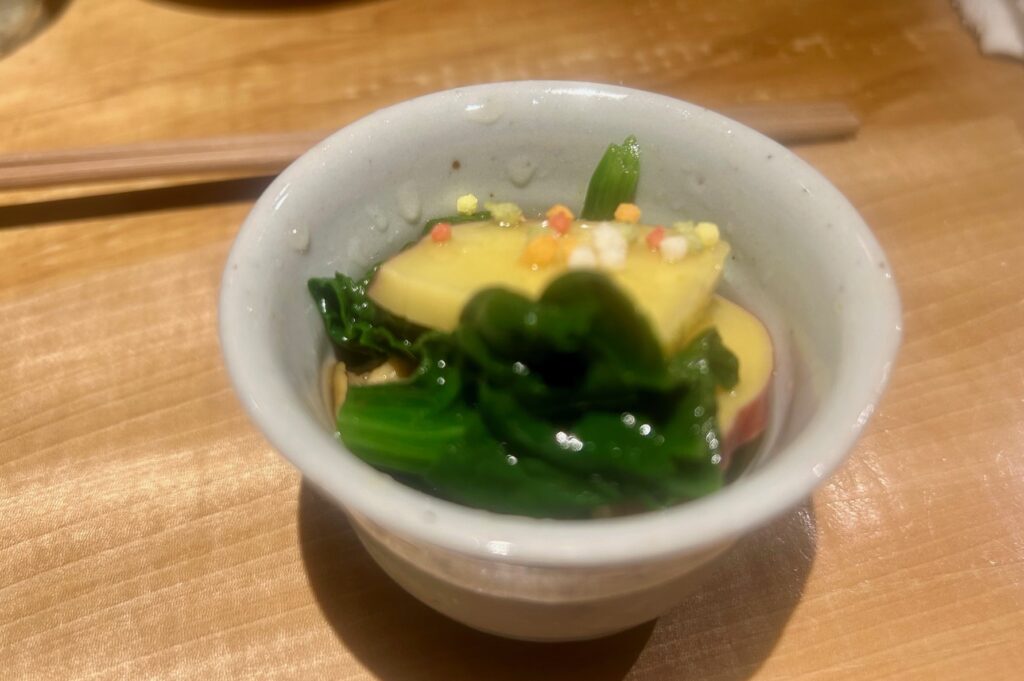 先付けはさつまいもと縮み法蓮草のお浸し。酢橘ソーダと一緒にいただく。