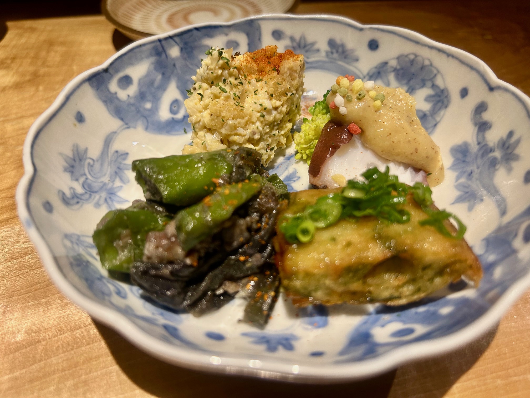 ここから焼酎に切り替えて、おまかせあて3種類を注文「まーしーのポテサラ」「青さのチヂミ」「ししとうと茄子皮の肉味噌炒め」「タコとブロッコリーのぬた」。それぞれに手間がしっかりかかっていて何をいただいても美味しい。