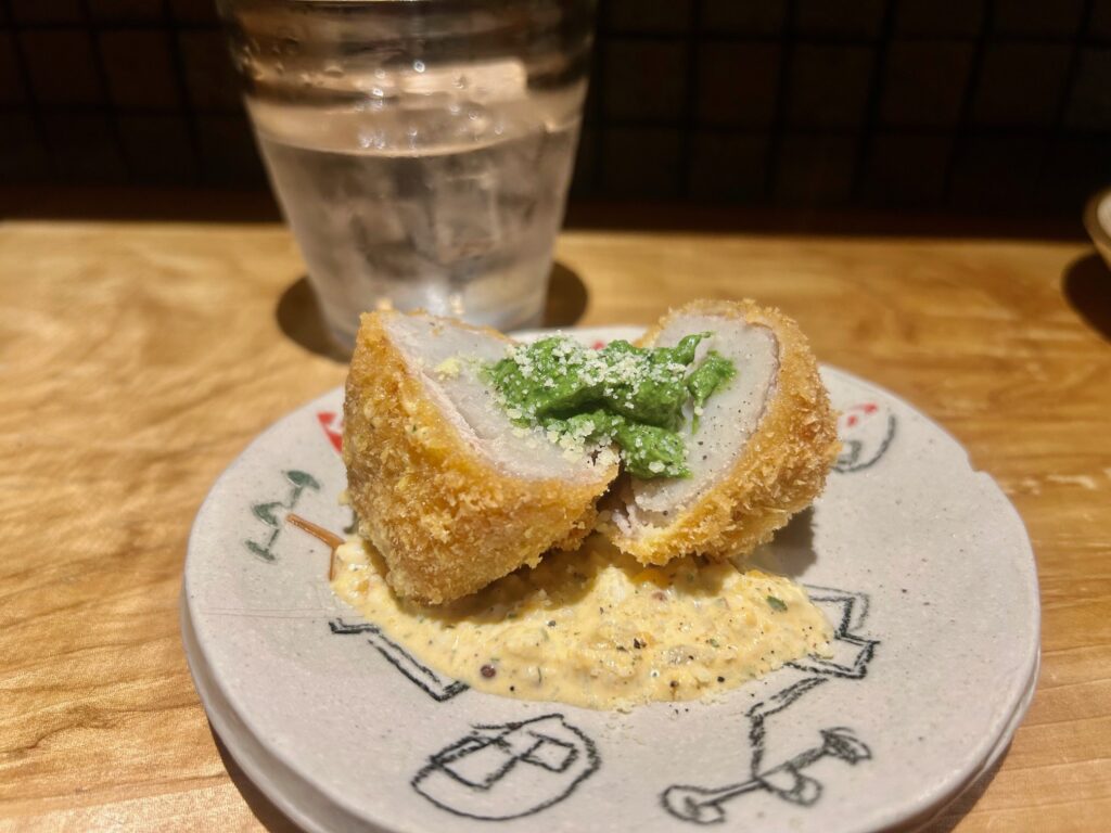 炊いた海老芋の豚巻きフライ法蓮草ソースとタルタル。。お酒がよくすすむ一品。