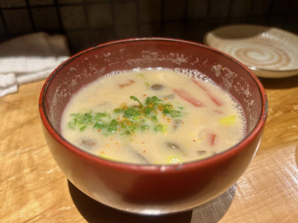最後に野菜たっぷりの粕汁をいただきました。お酒を4杯いただいてこの日の支払いは5400円。入店から退店まで45分。サクッと一人で美味しいものをいただきたいときに重宝しています。予約はインスタから・・・