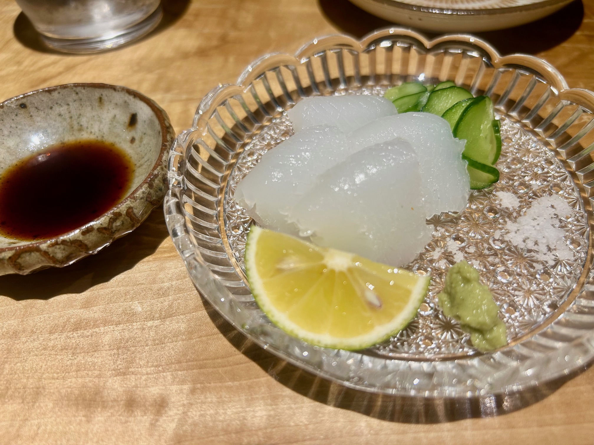 ご主人の出身の丹後産のアオリイカ。切りつけ盛り付けがとても美しい。