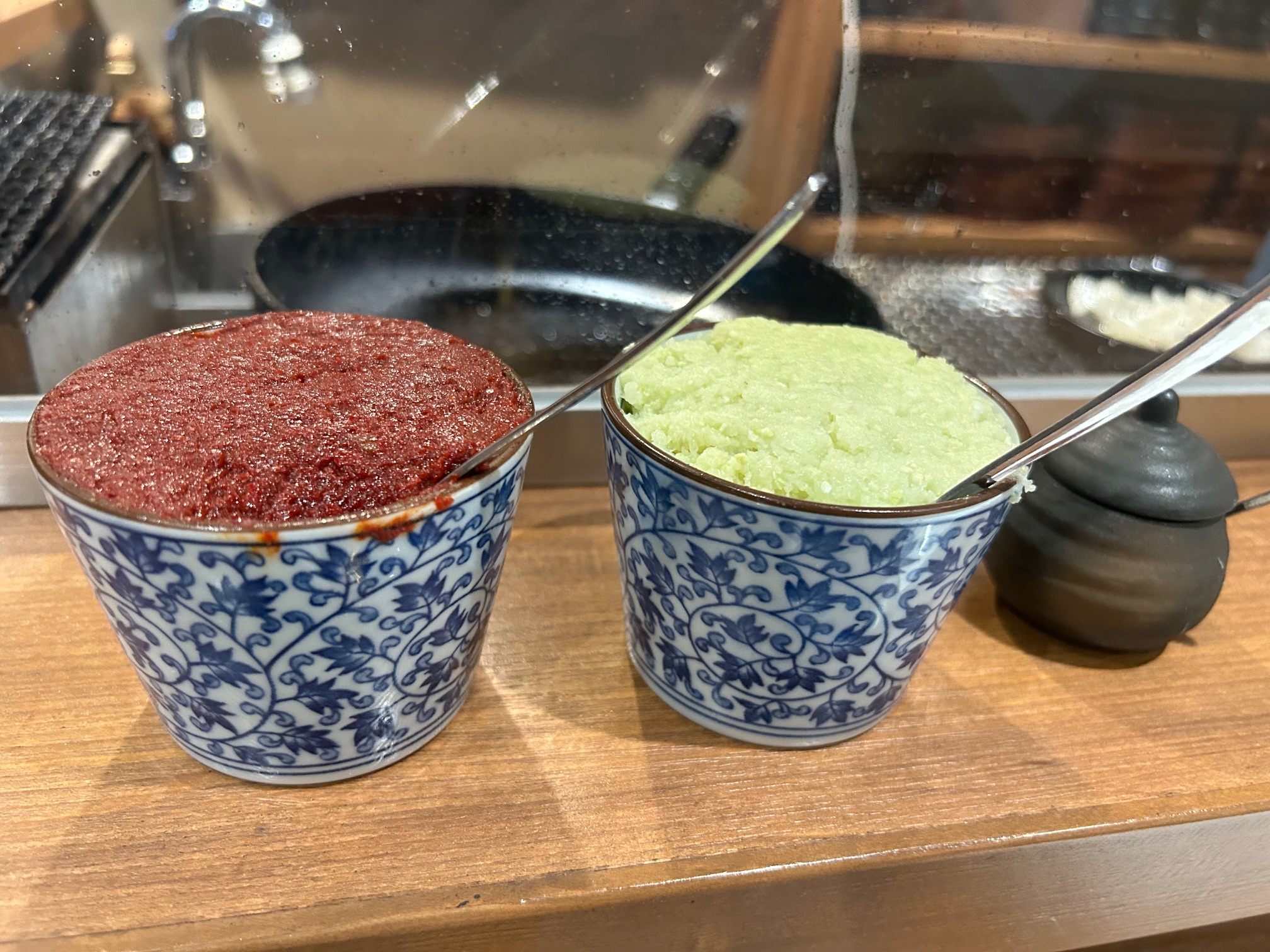 醤油ベースのタレと絡みの効いた赤味噌をベースにした調味料、大根おろしと山葵を合わせたもの、生ニンニクなどを合わせていただくと味変を楽しむことができる。