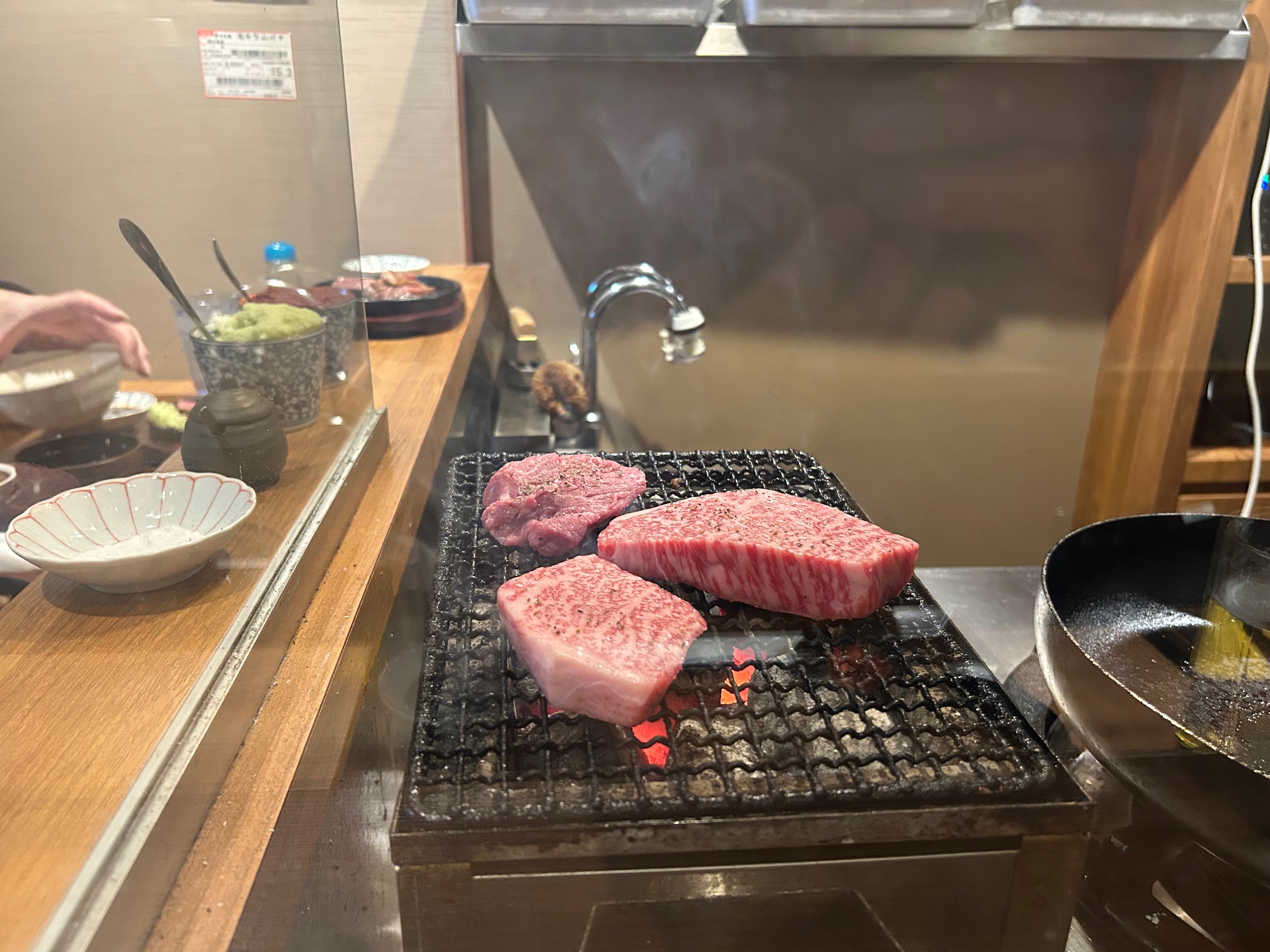 綺麗にサシの入った肉は網で炭焼きした後にフライパンで肉の脂を使って揚げ焼きをしてから、少し休ませてさらに炭焼きして余分な脂をとって提供。シズル感たっぷりでとても丁寧に火入れをされるのを見ているだけで食欲がでる。
