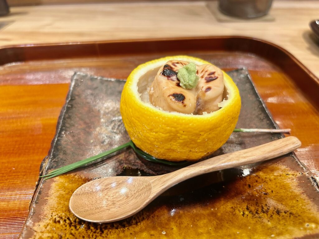 醤油漬けにしてから炭火で炙った河豚白子の飯蒸し。柚子釜の香りが秀逸。