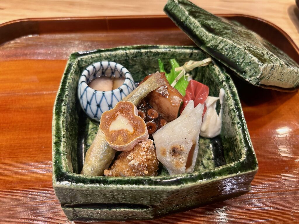 八寸色々 公魚、赤蒟蒻、干し柿のクリームチーズ、煮蛸、唐墨餅など。。日本酒飲みにはたまらない酒肴でまさに眼福。