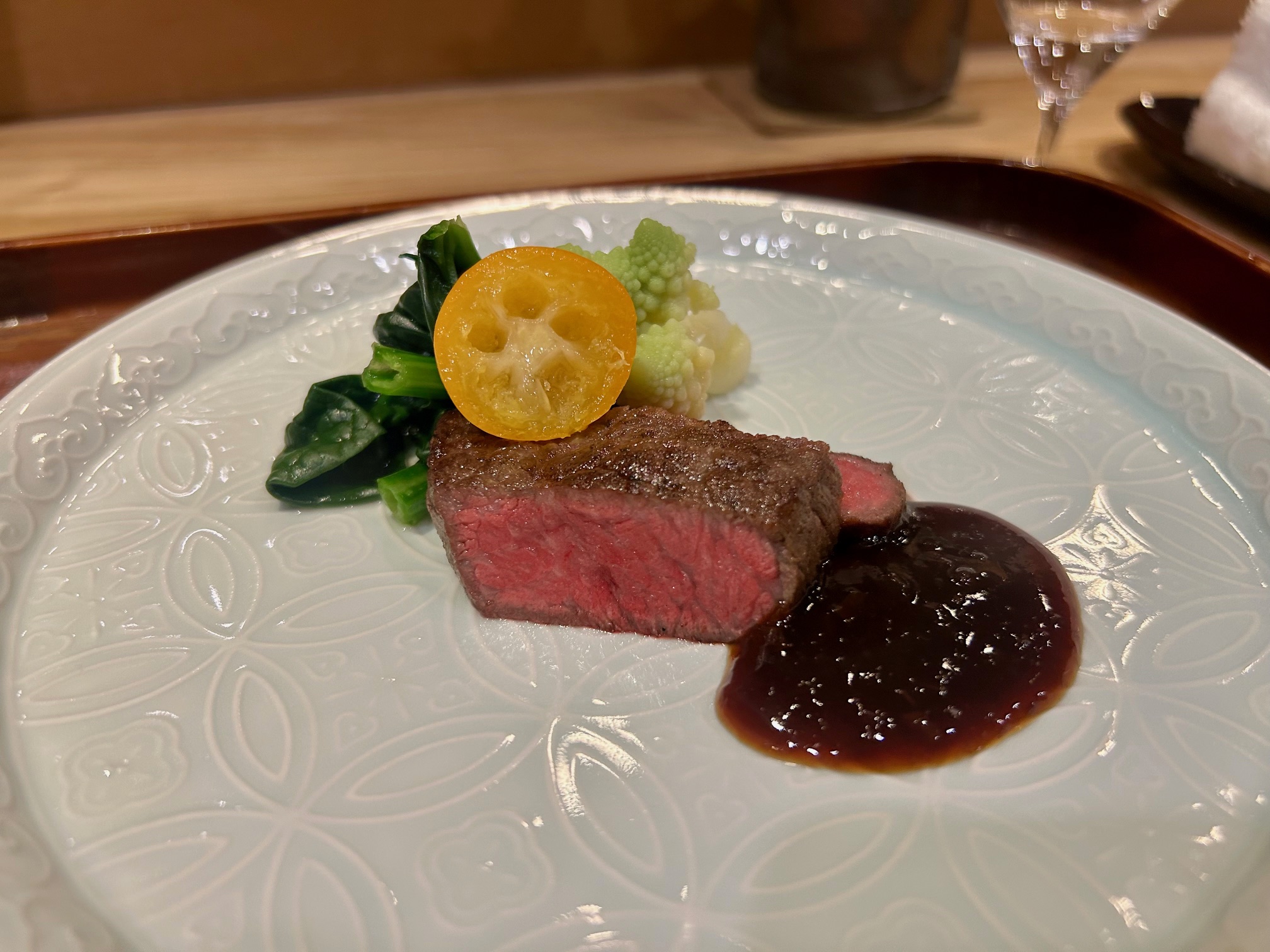 和牛ランプ肉の炭焼きは醤油と金柑のソースで。金柑と蕾菜が添えられる。赤身肉の美味しさを堪能できる