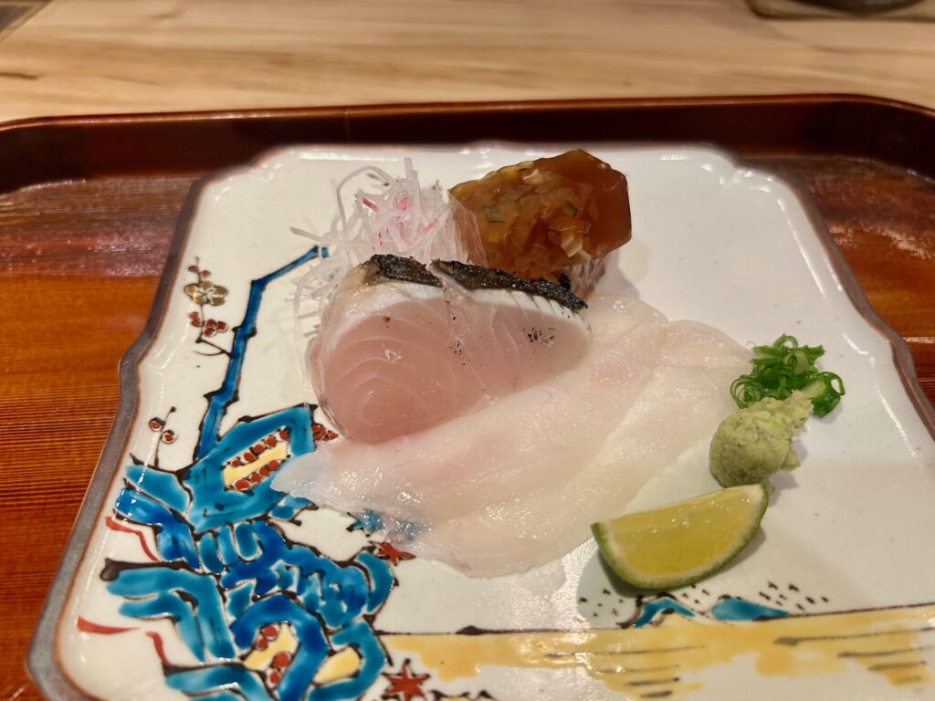 活鮮は3kgオーバーのトラフグ。熟成させているので味が濃厚。皮目を炙った鰆、河豚皮の煮凝りが添えられる。これだけで日本酒が進みまくる。