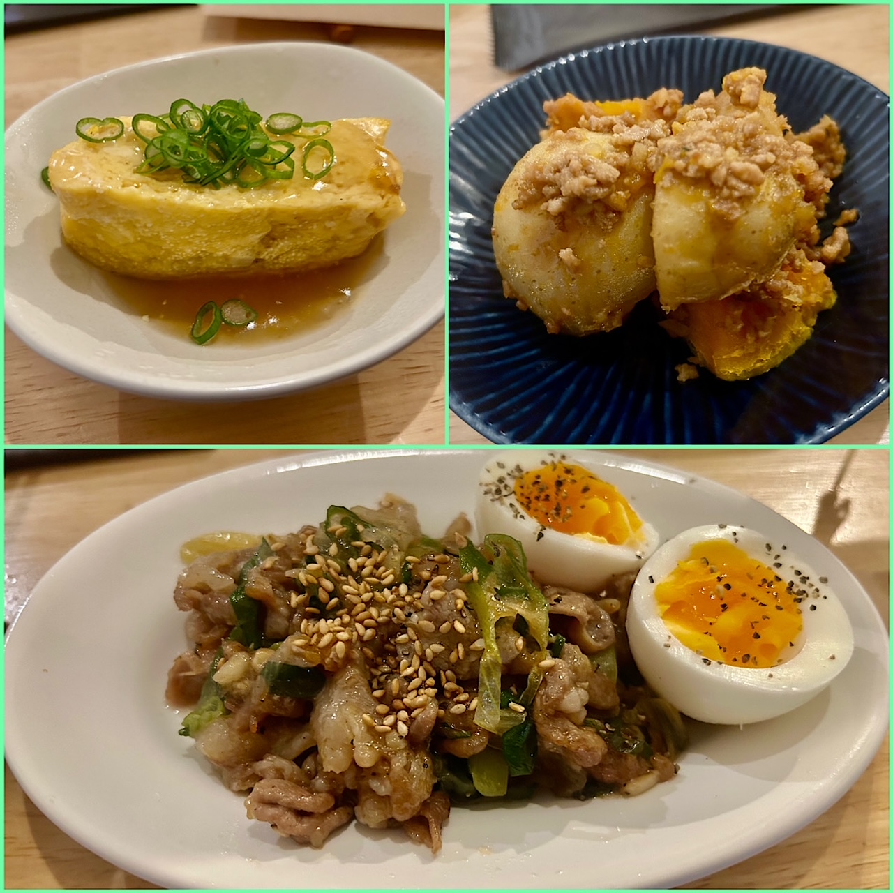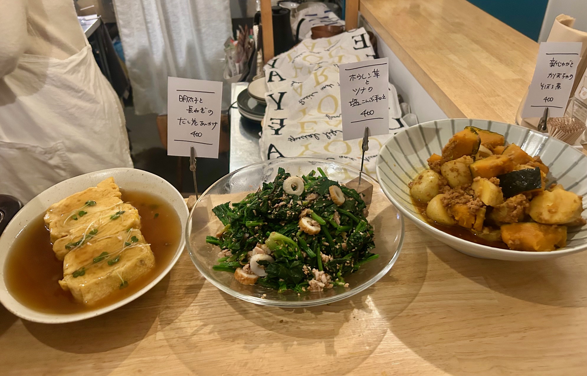 明太子とネギの入っただし巻き玉子400円はあんかけ仕様。ほうれん草とツナの塩昆布あえ400円、新じゃがとかぼちゃのそぼろ煮400円なども並ぶ。このほかにもレギュラーメニューもあって何度来ても飽きることがない。