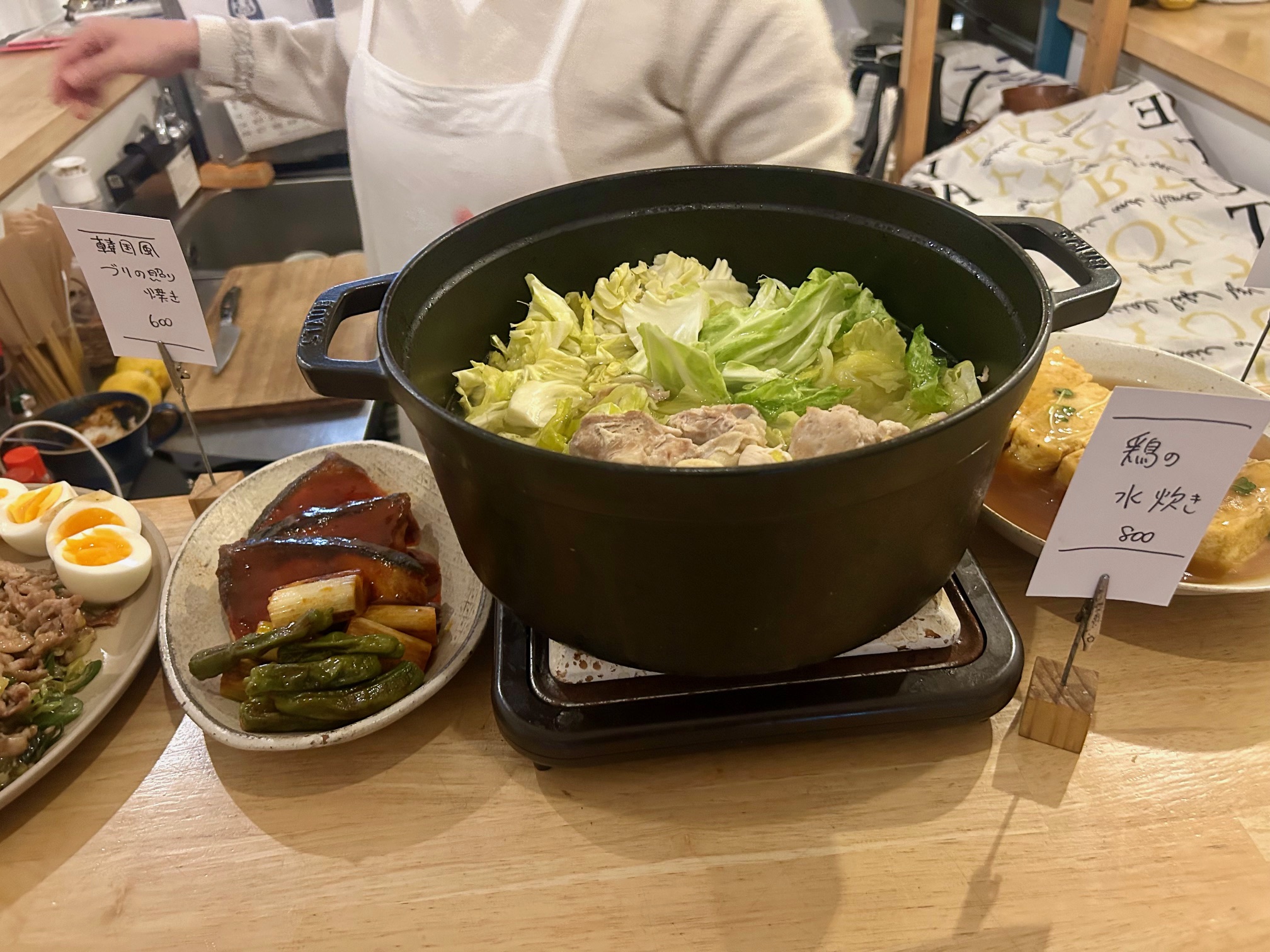 鰤の照り焼き600円はコチジャンなどを入れて甘辛タレを使用した韓国風の仕上がり。大きな鍋に入った鳥の水炊きは手羽元を使用。残ったスープでラーメンも作っていただけるとのこと。