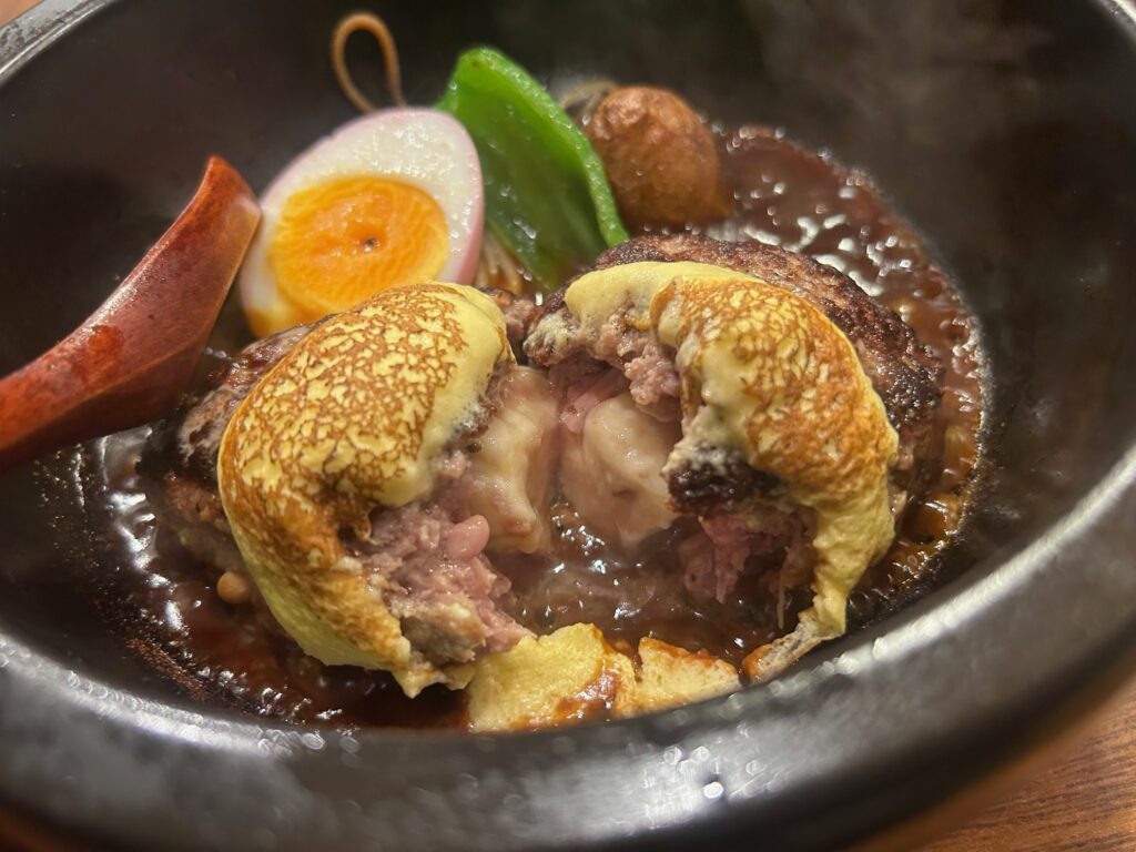 しばらくしてビビンバの器のような大きな丼にジュージューと音を立てて着丼。ハンバーグの重量は180gとのこと。スタッフさんが肉は豚と牛の合い挽きと言っておられた。濃いめのデミグラスソースはご飯との相性を考えて味噌や和風出汁も入っているらしい。