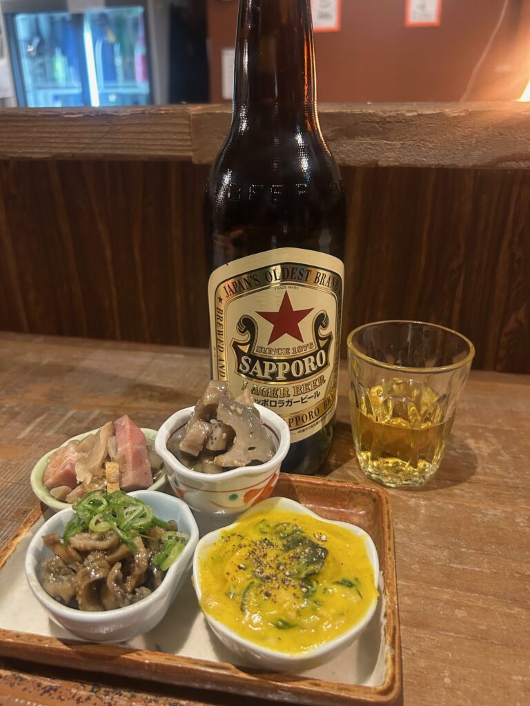 今回は赤星の大瓶ビールとお一人様限定おばんざい4種盛800円を注文。