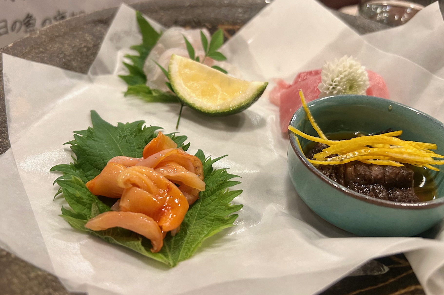 氷の上に盛り付けられた刺身は泉州産の赤貝、平目、茶振りなまこ、シビマグロなど。