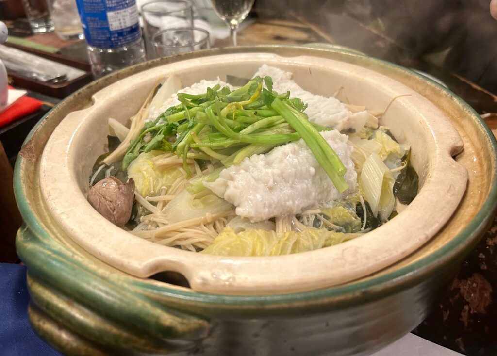 大きな土鍋で供される骨切りをした伝助穴子の蒸し物。ポン酢でいただく。。脂がよく載っていてふわふわ食感でとても甘い。