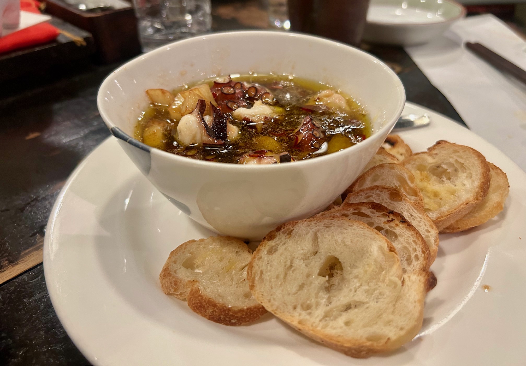 38年間継ぎ足したソースが入る蛸のニンニクオイル焼き1200円はこの店のレコメンドメニュー。世にアヒージョという料理がなかった頃からメニューに並ぶ。