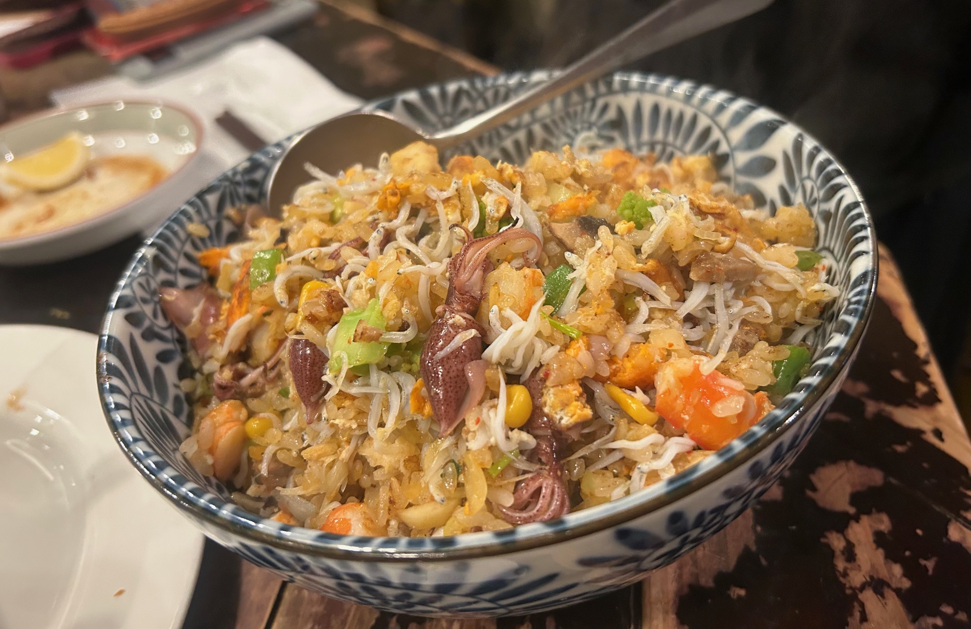 最後は32種類の具材が入るまかないピラフを注文。米の量よりも具材の方が多い。お酒が進む美味しさ。味も個性的でおすすめの逸品。何をいただいても美味しくて大満足。ごちそうさまでした。