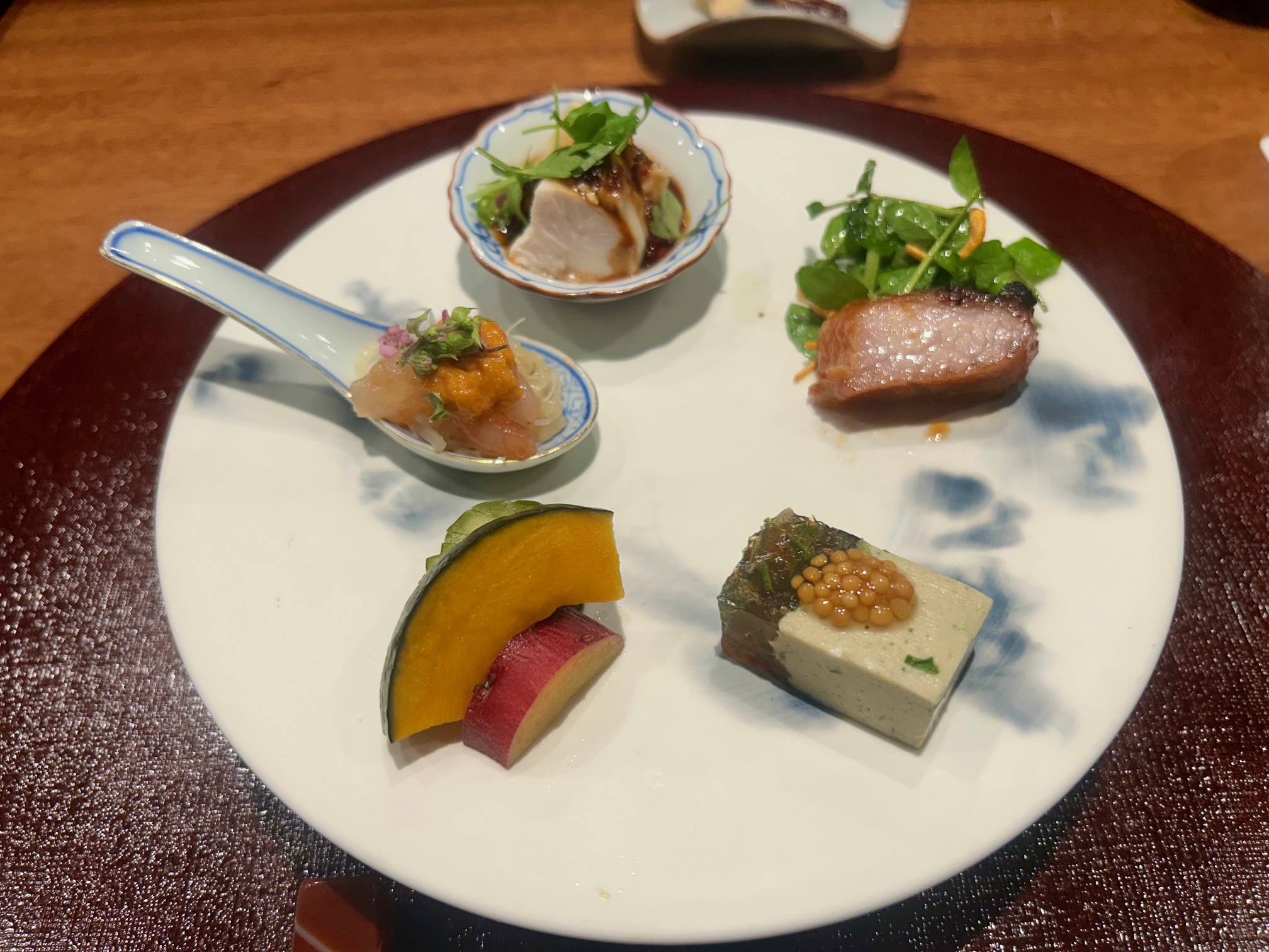 美しく繊細に盛り込まれた前菜は鈴カボチャと胡瓜とさつまいも酢の物 初めて見るビジュアルのピータン豆腐 釜焼きのチャーシュ 味わい深い涎鶏 クラゲと甘海老と雲丹など。