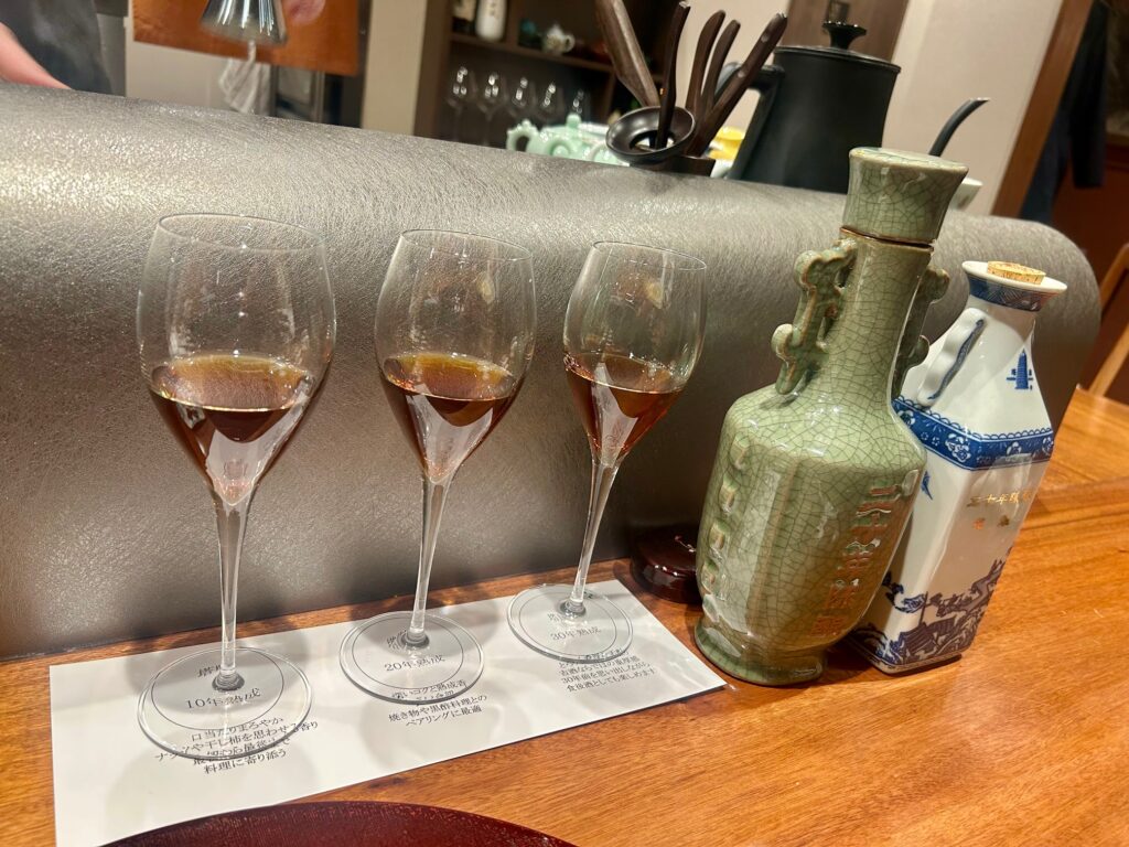紹興酒飲み比べ3種3800円を所望 10年熟成は口当たりまろやかでナッツや干し柿の香り 20年熟成は深いコクと余韻 30年はトロトロの口当たりで重厚感あり