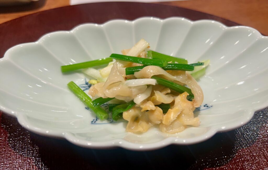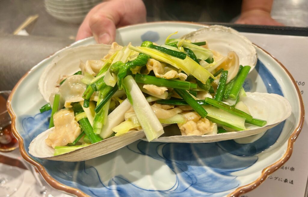 白ミル貝と黄韮の炒め物 出来立てを貝の殻の上に豪快に盛り付けてプレゼンテーション