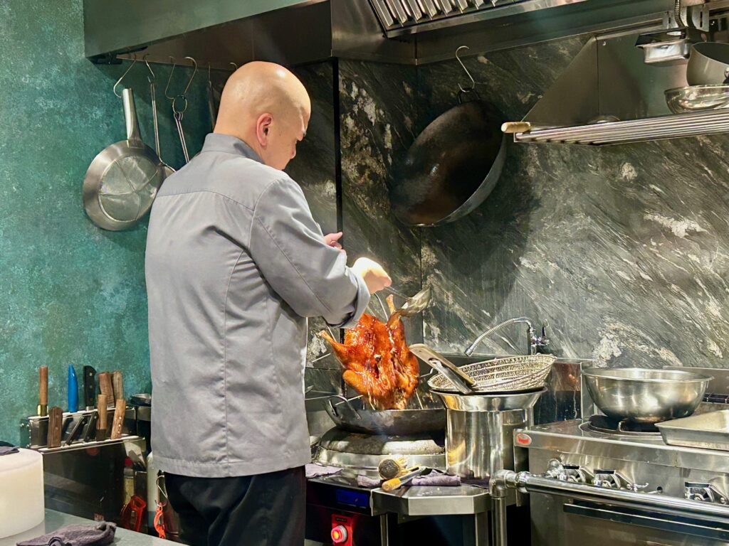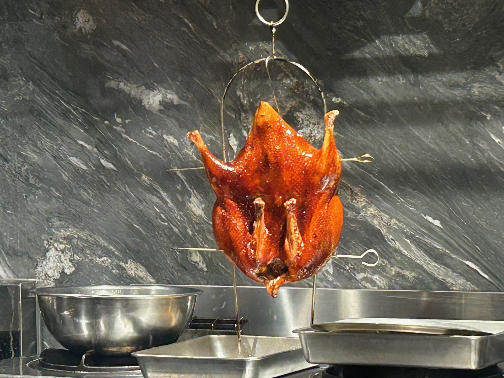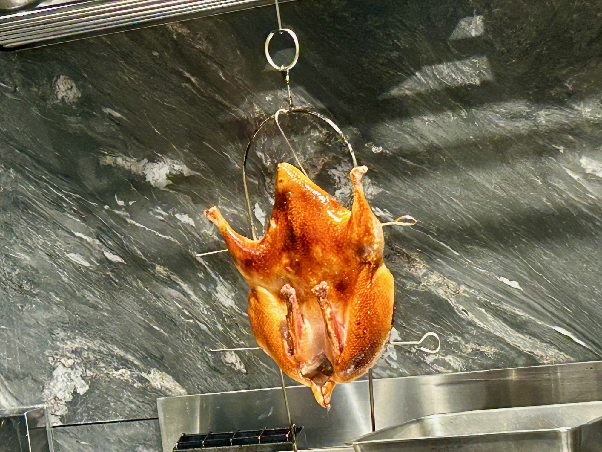 事前に軽く火入れされたアヒルが厨房に吊るされている。広東式なので背中が開かれた状態で調理される。