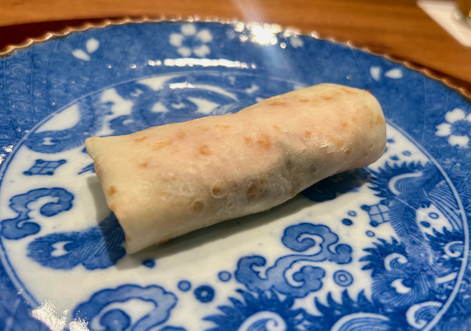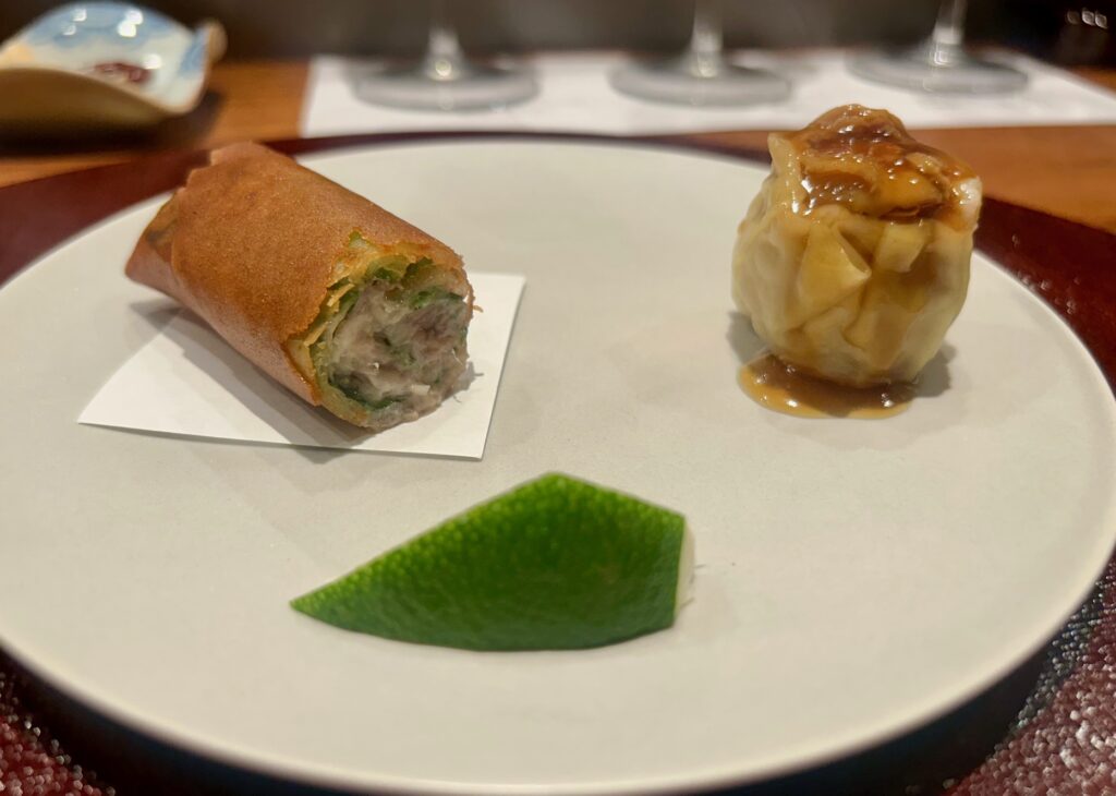 新鮮な大葉鰯を春巻きにしたもの 鰯をそのまま食べている錯覚に陥る つなぎを使っていない肉感たっぷりの焼売には鮑が添えられる オイスターソースをかけて仕上げるのもさすが