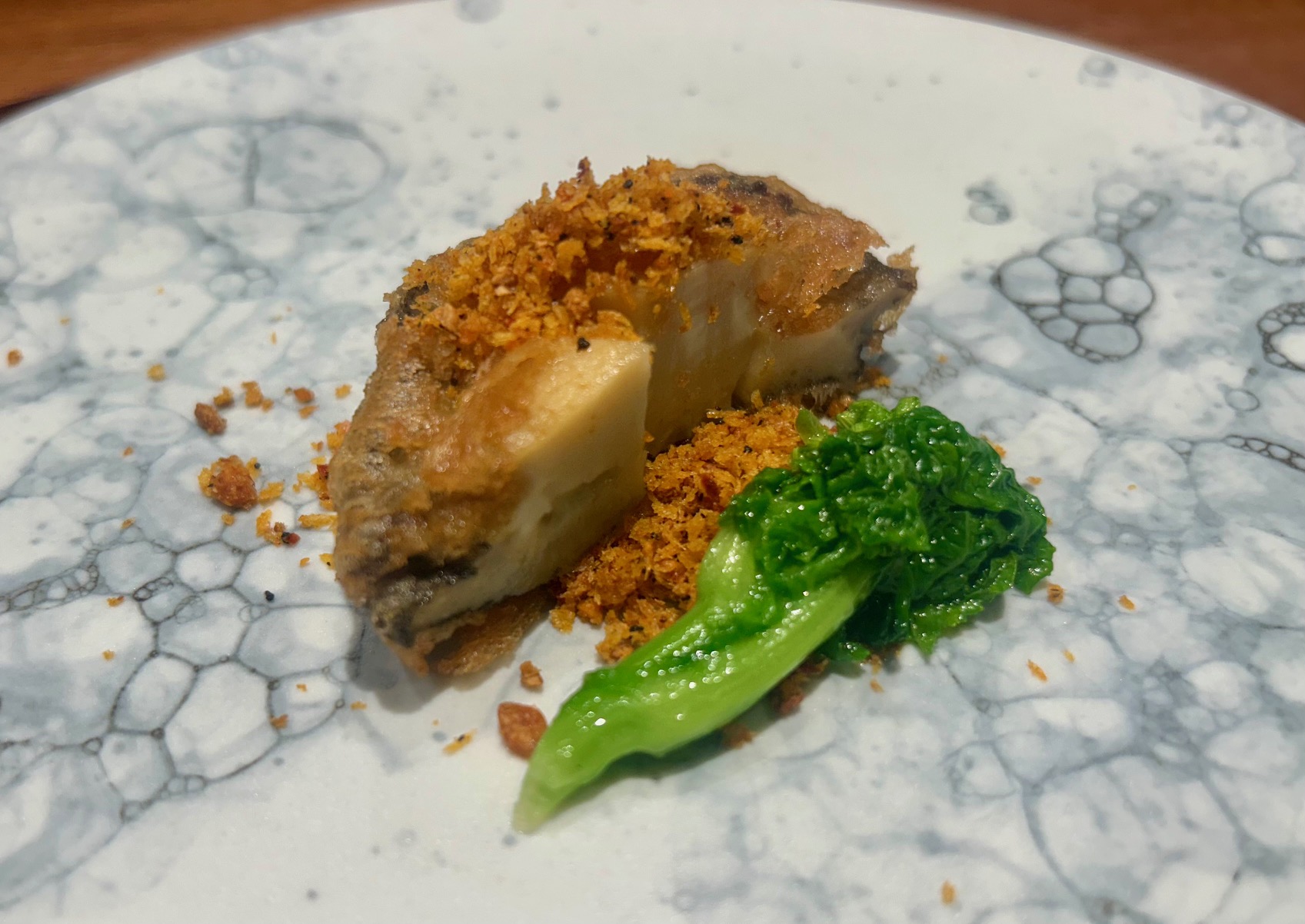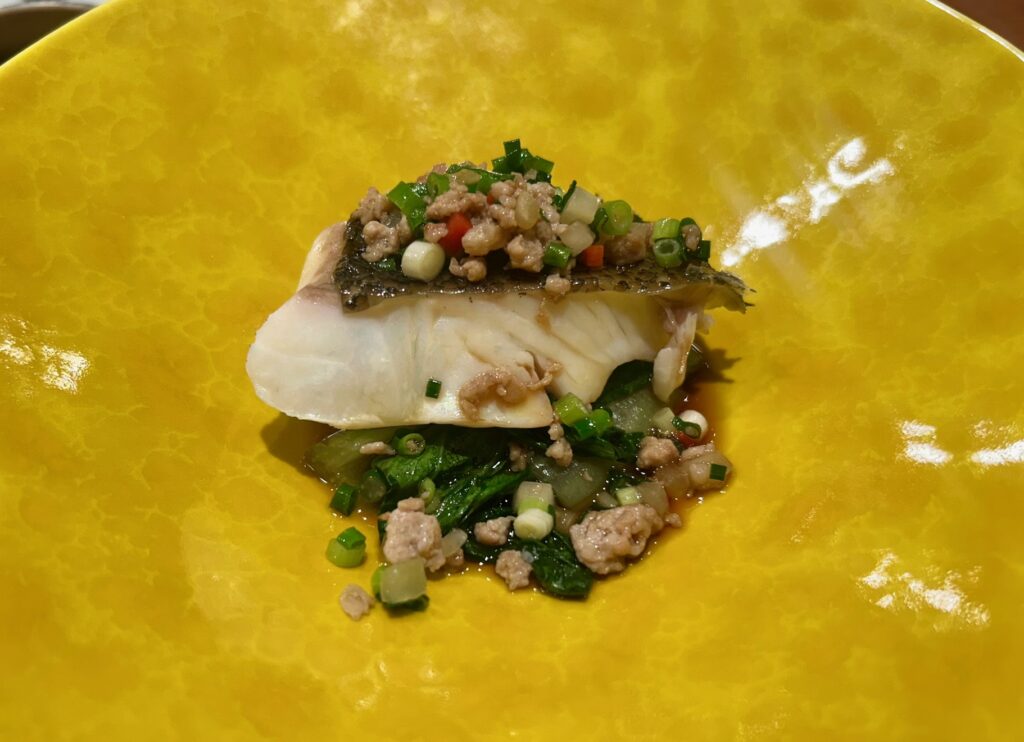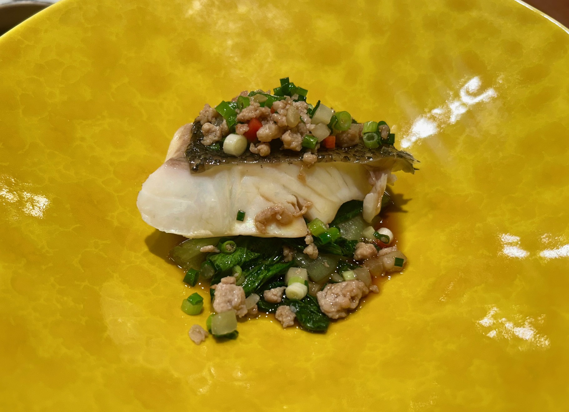 2.8kgの寒平目の蒸し物には漬物とひき肉の酸味のある葱油ソースがかかる ハタやクエでよく見る広東料理の華のような料理をオマージュしたもの シェフ独自の感性が光る逸品
