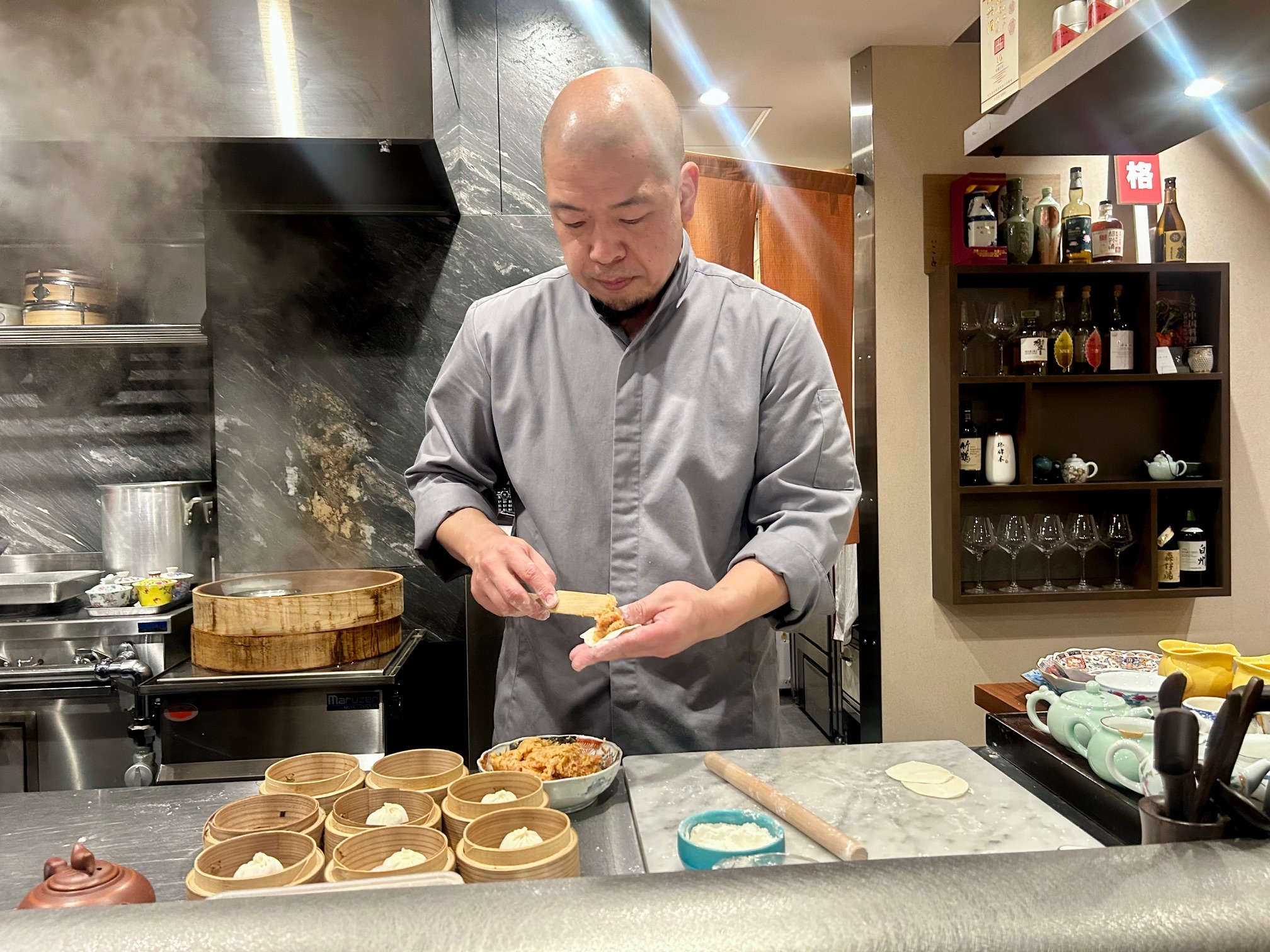 目の前で上海蟹の身の入った小籠包を包む 手際の良さと繊細さに脱帽