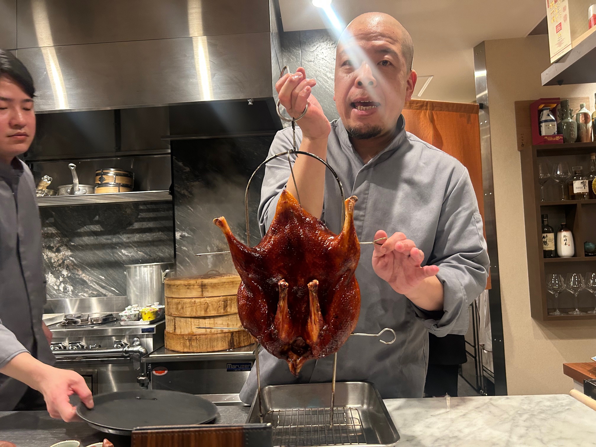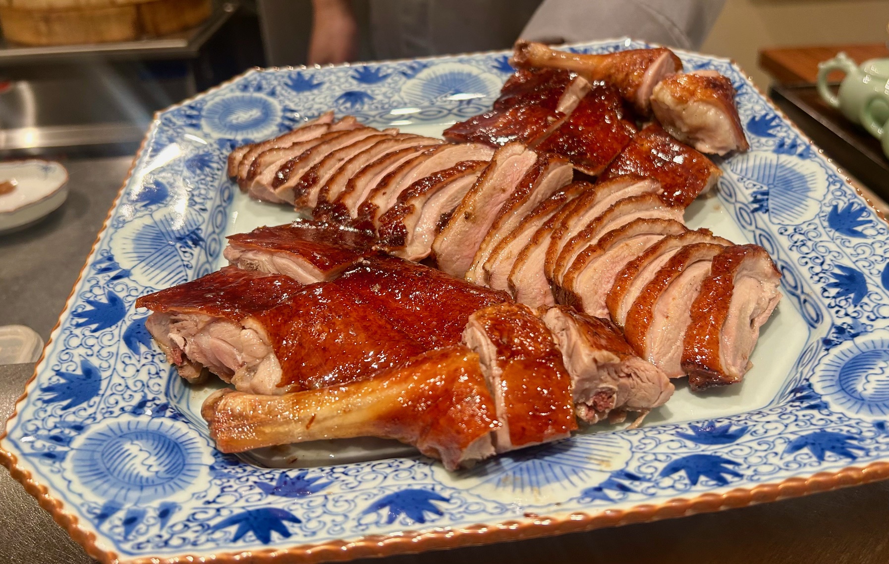 パリパリに仕上がった北京ダック。広東式なので肉も一緒にいただく