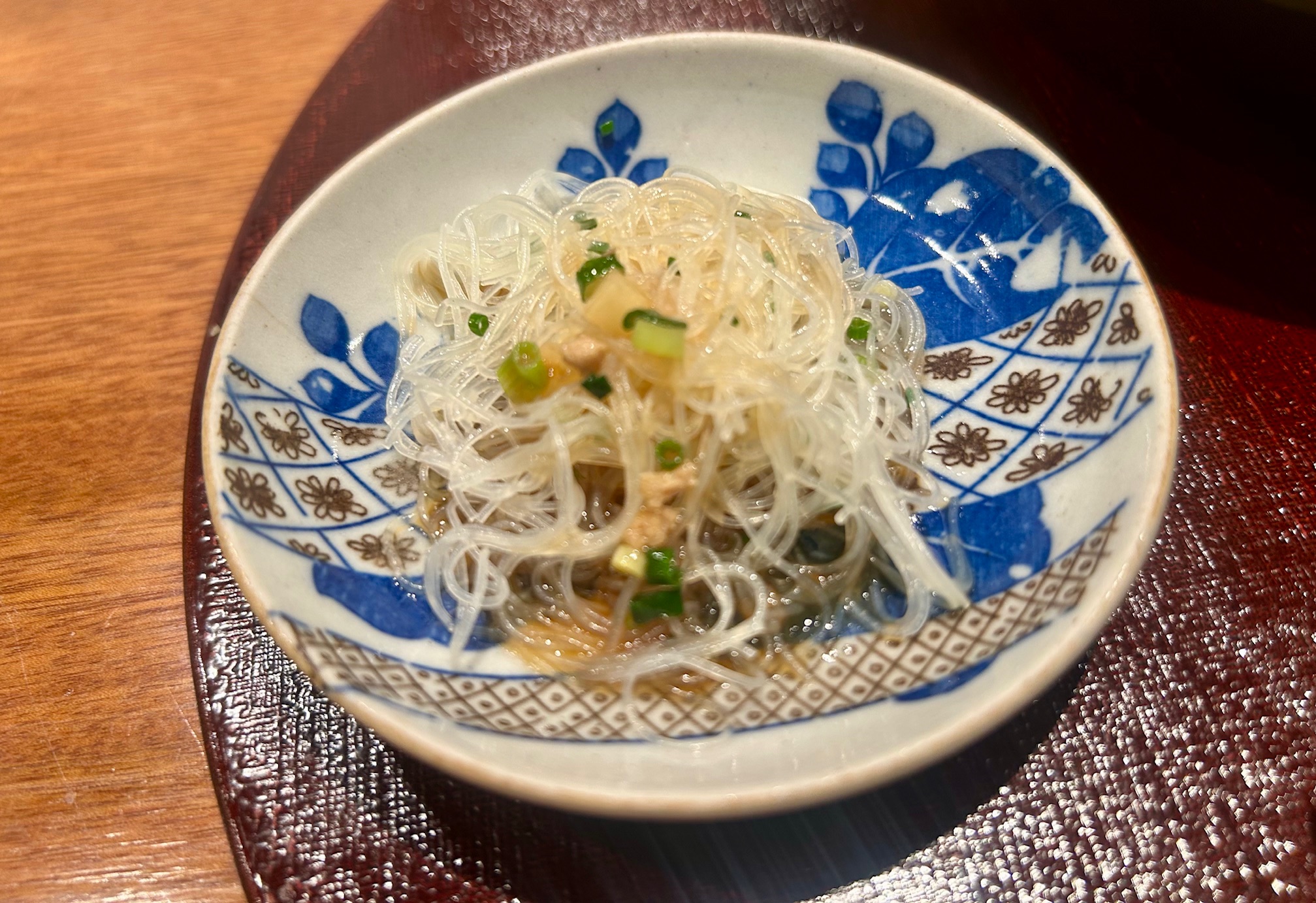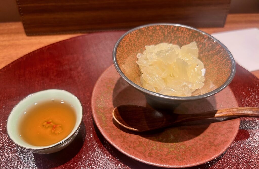 店内は、落ち着いた色調でまとめられたモダンで清潔感のある空間。カウンター6席と6名掛けの半個室テーブル席。今回は調理風景が見える正面カウンター席に案内いただく。夜は18時半一斉スタートで16000円のコースのみ。オプションでフカヒレの姿煮などをつけることができる。