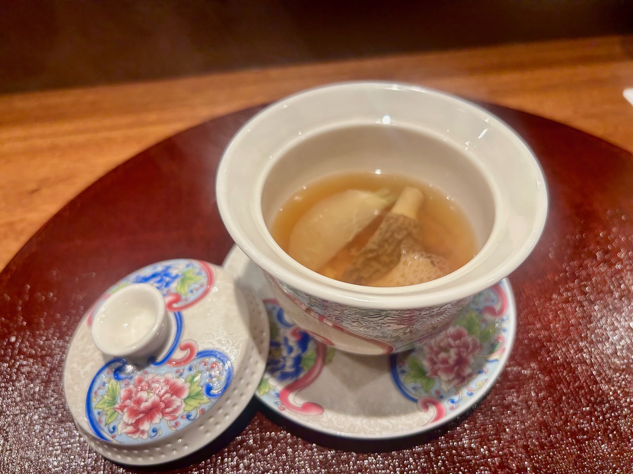 キヌガサダケ、モリーユ、アミガサダケ、干し椎茸、つぶ貝が入る漢方系の蒸しスープこれがこの日のMVP なまこや燕の巣、鮑、魚の浮袋などが入った中国の高級料理の佛跳墻(ぶっちょうしょう)の簡易版と言っていたが幾重にも旨味が重なっていて驚くくらい美味しかった