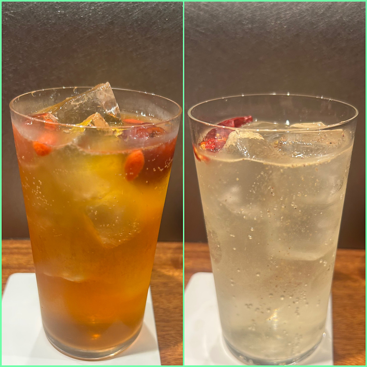 料理と一緒にいただいたシグニチャーのハイボールは10年紹興酒に干し梅、クコの実、なつめ、レモンの入ったもの 麻辣白酒ハイボールは白酒ベースに唐辛子と山椒でスパイシー感を出したもの 共にオリジナルでこのお店で初めていただきました