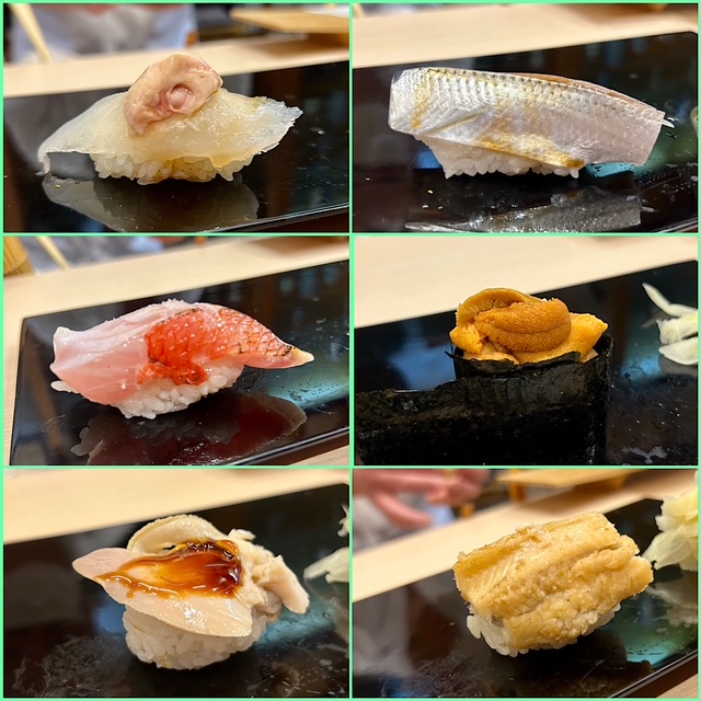寿司はお任せ6貫を注文する。カワハギ肝乗せ、浅く締めた小肌、皮目を炙った金目鯛、北海道の雲丹、煮蛤、煮穴子など。どれも新鮮で切りつけも大きくて美味しくいただく。