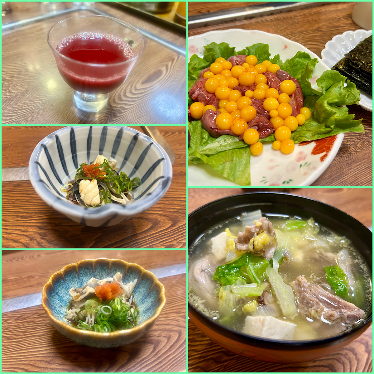 千日前のスッポンの丸元。寿司屋なんだけどほとんどの客がスッポンのコース6500円を注文される。エンペラと腸の酢の物。卵と肝の刺身、スッポンスープ、雑炊のセット。年中同じメニューだけど40年くらいずっと通っている大好きなお店。