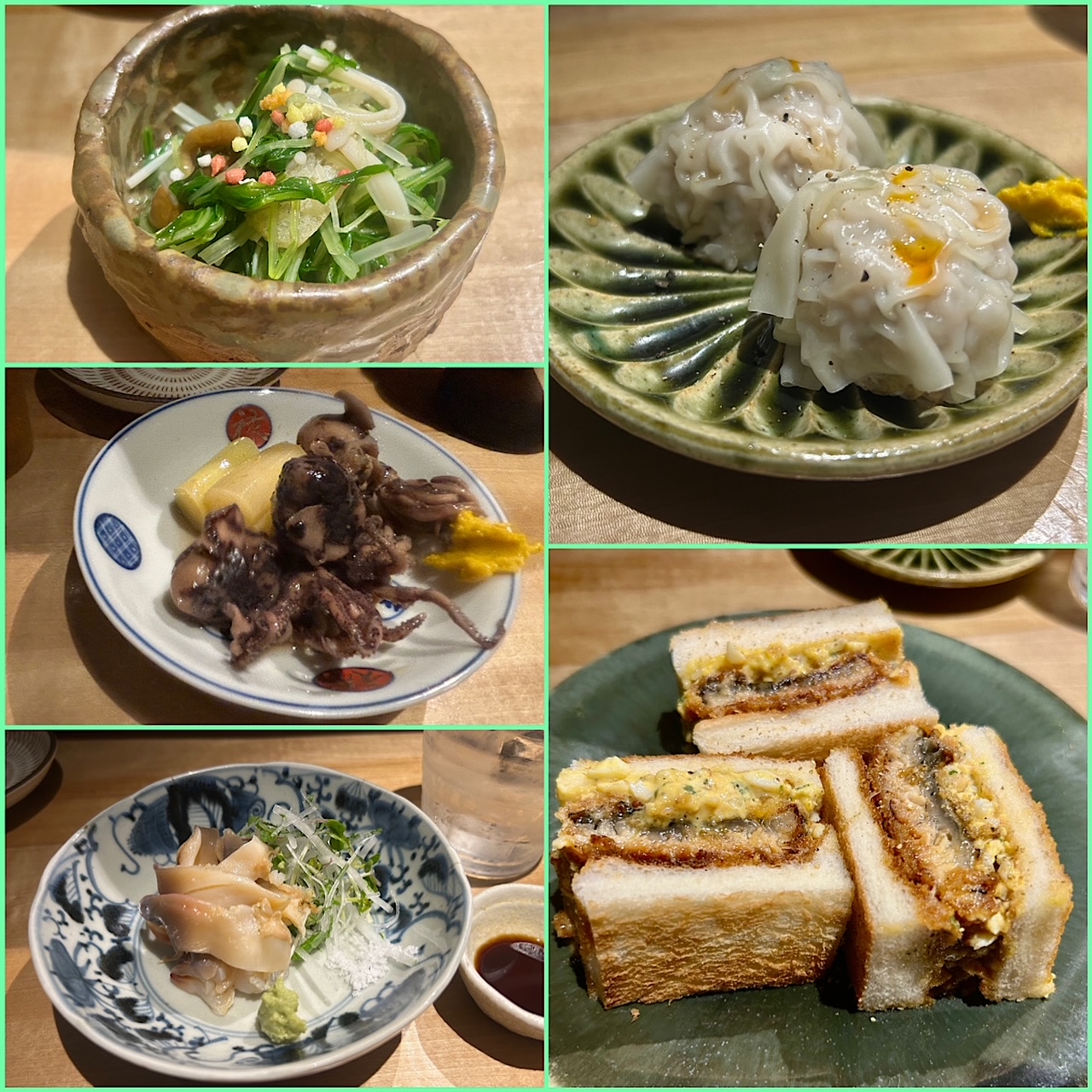 毎月一人で訪問している心斎橋の食堂まっすぐ。突き出しは水菜のお浸し、明石産ミミイカの煮付け、北海道のホッキ貝、筍入り手作りシュウマイ、鰻カツサンドなど。旬の食材を一手間かけて調理。創造性のあるメニューがいつも楽しみ。