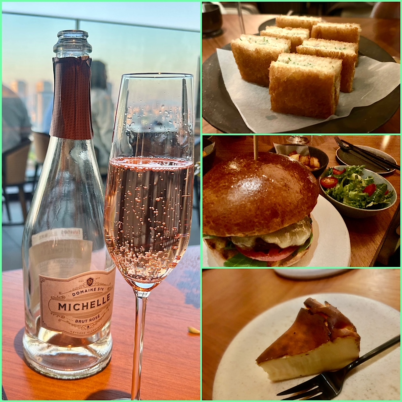 森ノ宮のホテルのパティーナ大阪で桜満開の大阪城公園を臨む高級ラウンジでスパークリングロゼワインのフリーフロー。食事のセットはイカのトースト、胡瓜の酢の物(写真なし)、ハンバーガ、チーズケーキ。支払いは一人20000円なり。ひえー!・・・