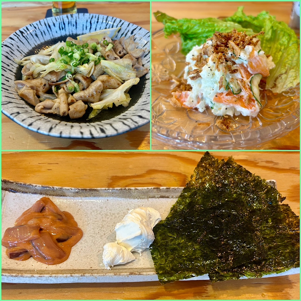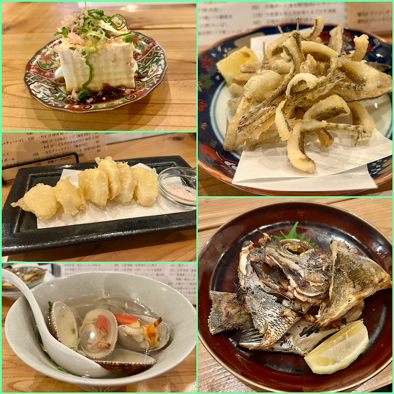 阿倍野眞ちゃん豆腐冷奴(小2)80円 岸和田産自然薯天ぷら480円 尾崎港直送すだれ貝酒蒸し780円 大阪湾ガッチョ唐揚げ780円 大阪湾コチと石鯛のかま塩焼き680円などをいただく。
