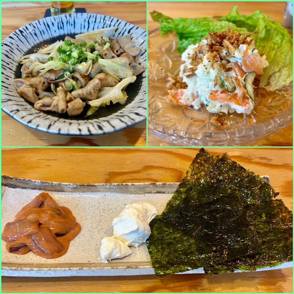 住吉公園の中の集積商業施設の中にある「ホルモン ミサイル」名物は塩だれホルモン680円(写真は2人前)。手作りポテトサラダ450円はその場でじゃがいもを裏漉しして作る。塩辛とクリームチーズと韓国海苔550円など。この施設で一番人気の繁盛店。