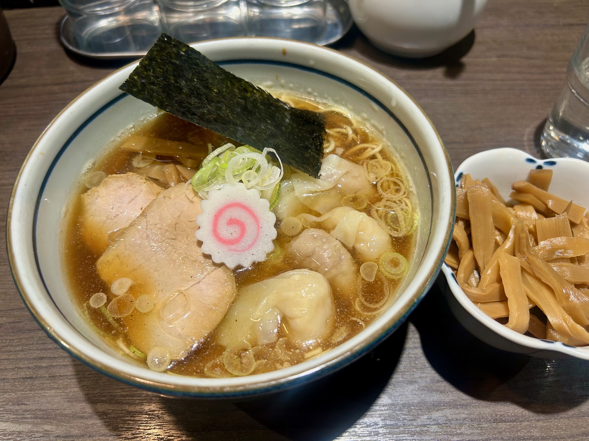 長居駅南に徒歩3分のかみなり雲呑。ワンタンメンが推し。この日は中華そばミックスワンタン入り めんまトッピングを注文ス。ワンタンの美味しさはともかくスープが秀逸。豚ガラ・豚肉・玉ねぎ・じゃがいもなどを煮出したコクのある豚清湯スープに3種類の煮干・鯖や鰹などの節類をふだんに投入したあびこの姉妹店の「閃」と同様のパンチのある煮干しの癖の強い味わい。