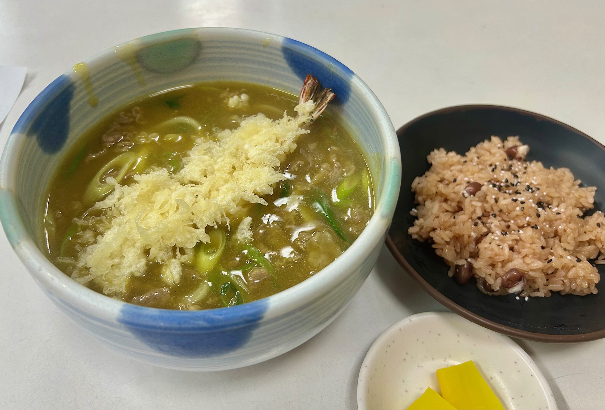 ヘビーユースする力餅食堂玉出西店。この日はカレーうどんに海老天をトッピングで贅沢な気分。赤飯も大好き・・・・