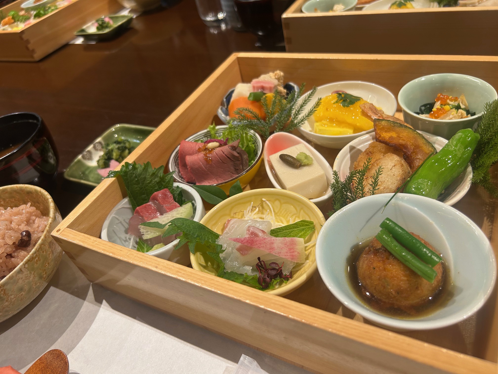 私どもの会社の新入社員の入社式を自社店舗(懐石料理 徳 住之江本店)で行い、その後みんなで会食。ランチメニューの九重膳1800円。平日のランチタイムに予約なしで召し上がっていただけます