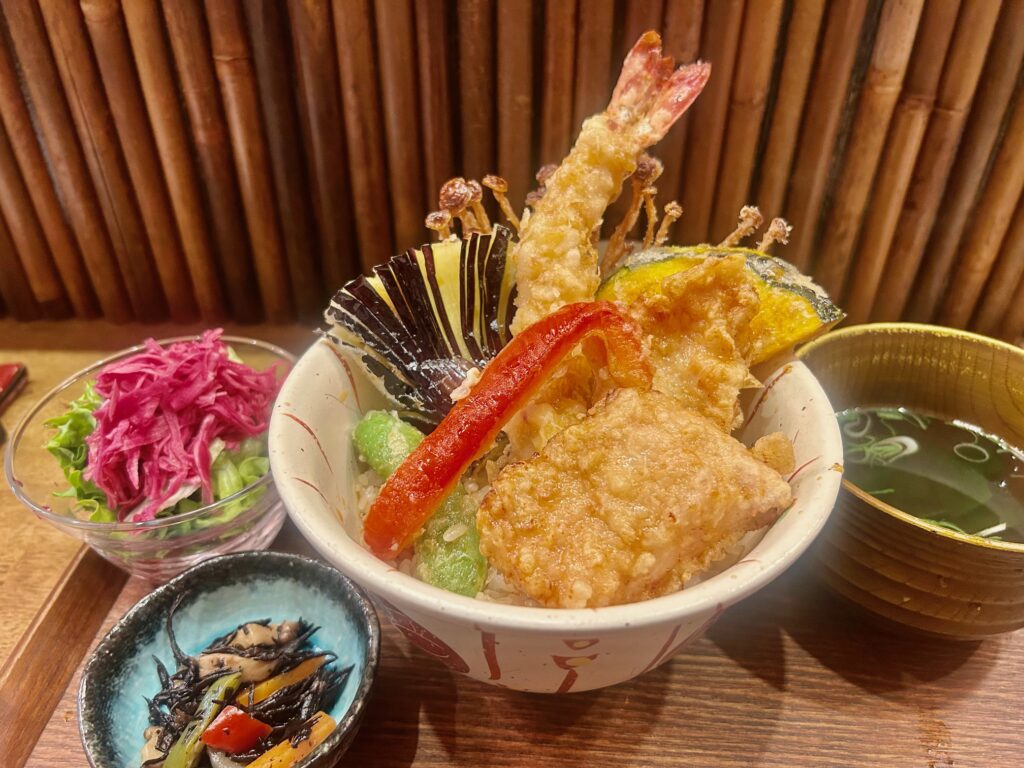 界隈では人気の天ぷら専門店。この日は大海老と鶏天の天丼1700円をいただく。海老は天然のシータイガーを使用 スナップエンドウ、南瓜、茄子、しっかり揚げたエノキ、パプリカなどが入る。