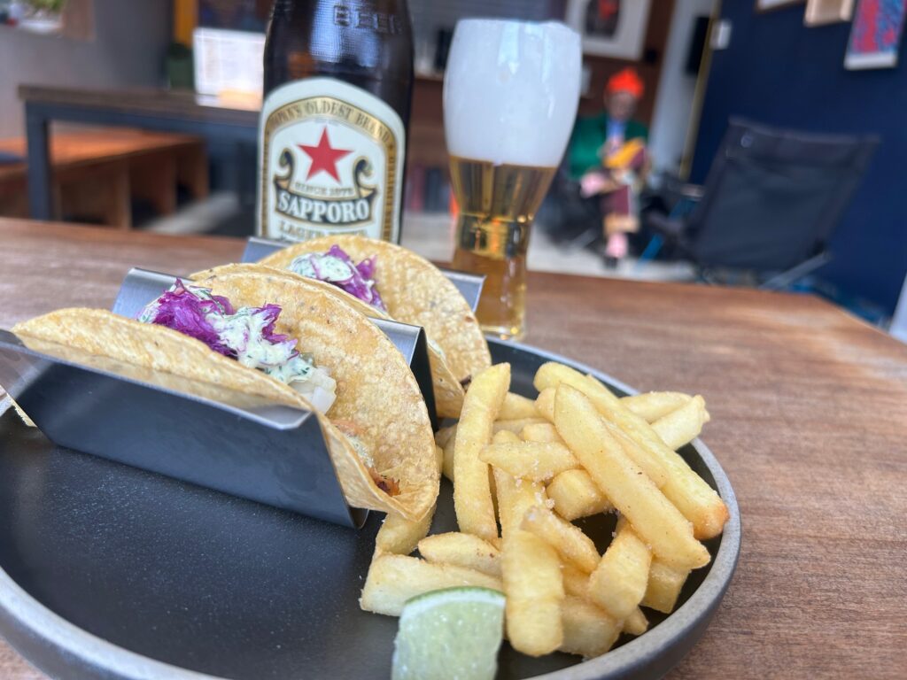 休みの朝は北畠のCOZY Coffe spot タコス1500円。朝ビールと一緒に楽しむ。食後の浅煎りコーヒーも最高。ウエストコーストをイメージしたお店もとても素敵。