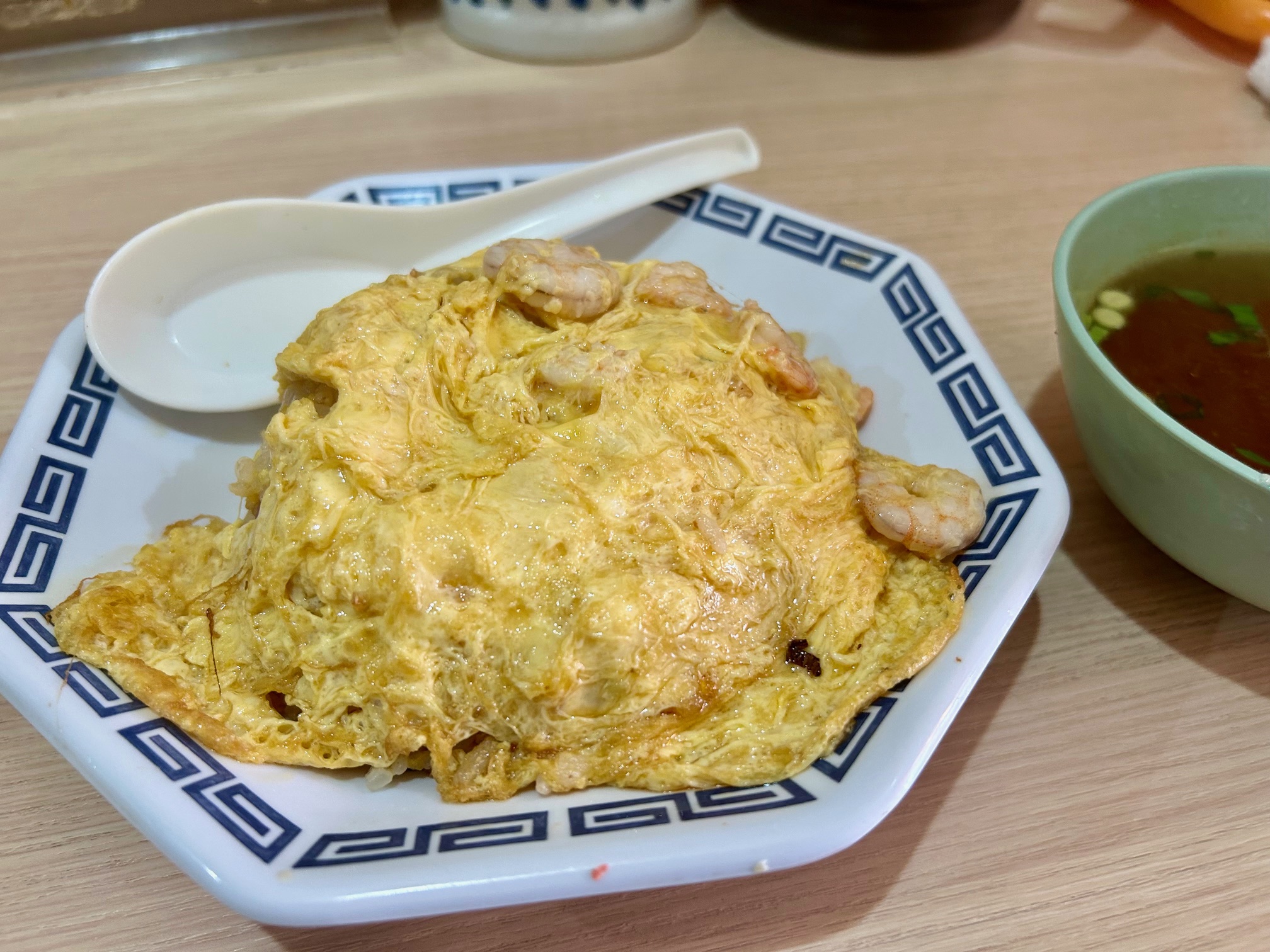 住之江区の東加賀屋にある大衆中華料理店の眠楽のエビ炒飯800円 仕上げにふわふわ卵を乗せて完成・・・