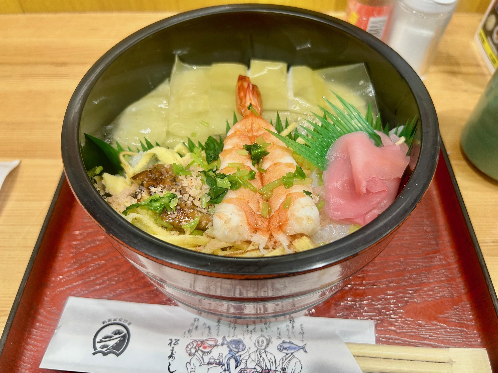しばらくして着丼。「桶すし」は鯛のバッテラとちらし寿司の合い盛り。